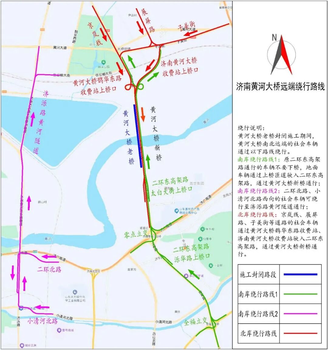 施工期间黄河大桥(老桥)禁止社会车辆通行,建议社会车辆绕行至黄河大桥(新桥)和济泺路黄河隧道通行,具体绕行路线如下: