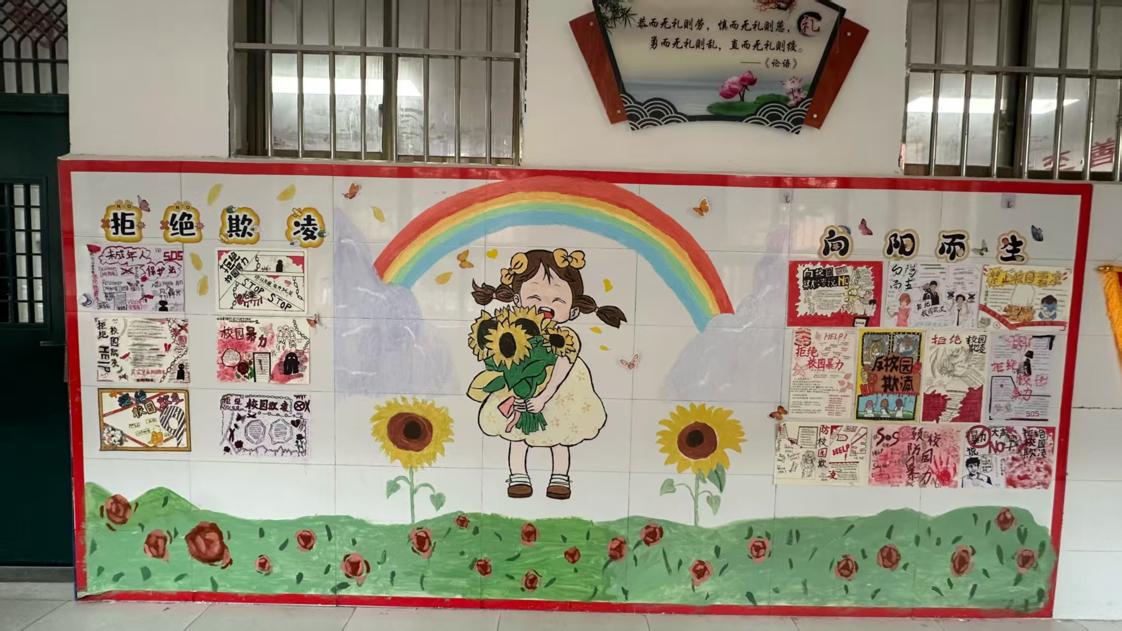 学校是塑造学生品格的重要场所,教室是学生生命发展的“第二家园”。班主任可在班内公开征集口号,并挂在班级教室墙壁和走廊外。笔者所执教的班级墙壁文化是以奋斗为主题,一方面在教室内外显眼位置挂条幅标语,并向每一位学生配发励志卡,要求将个人目标、座右铭等填写完整,集中在教室后墙壁“学生园地”处张贴。在班级教室门口安装班主任寄语牌,并将班训、班歌等内容印制成海报形式,起到春风化雨、润物无声的作用。