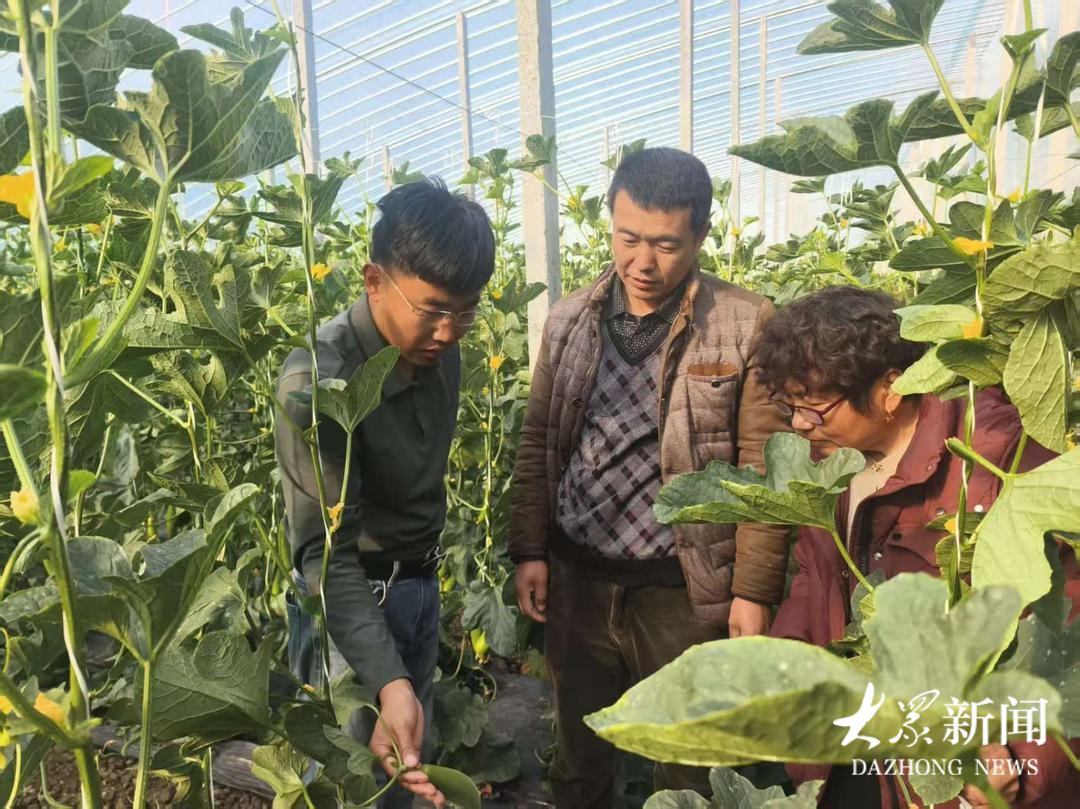 田斌(左一)学习甜瓜种植技术,查看坐果、膨果情况。