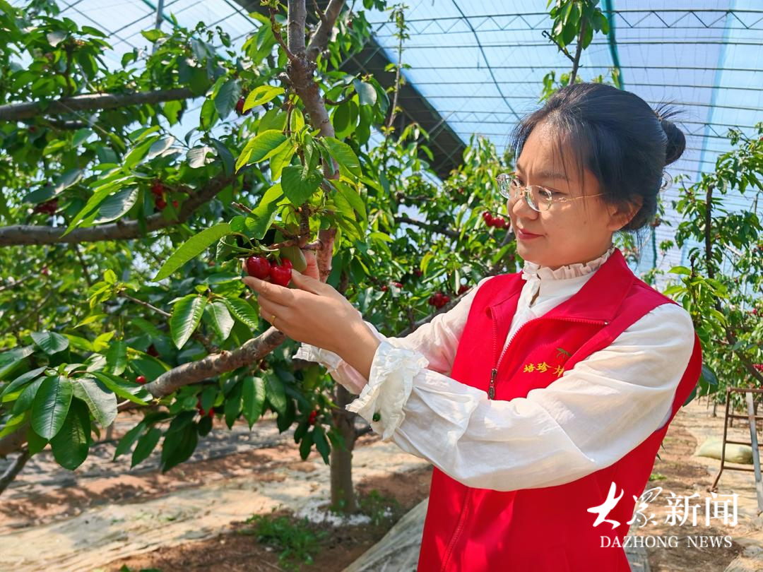 安丘市培珍樱桃生态种植农场的于汇丰正在查看成熟的大樱桃。