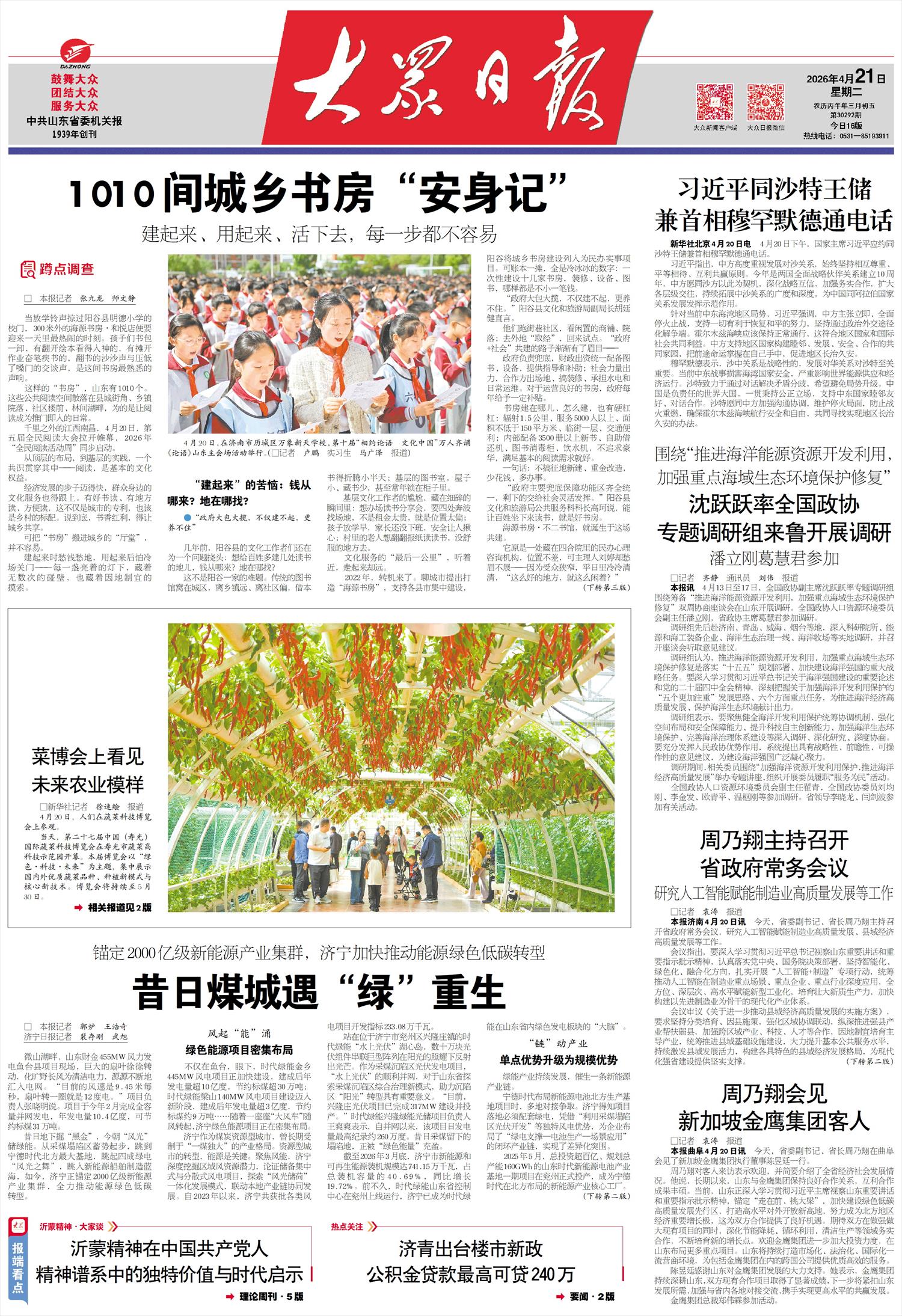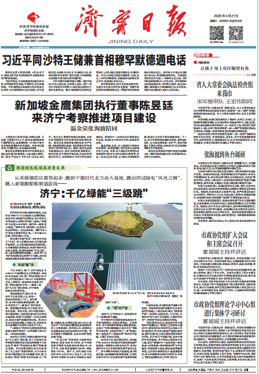 4月21日,大众日报联袂济宁日报,同时在头版重磅推出关于济宁推动能源绿色低碳转型的经验做法,探寻一座昔日煤城遇“绿”重生的密码。