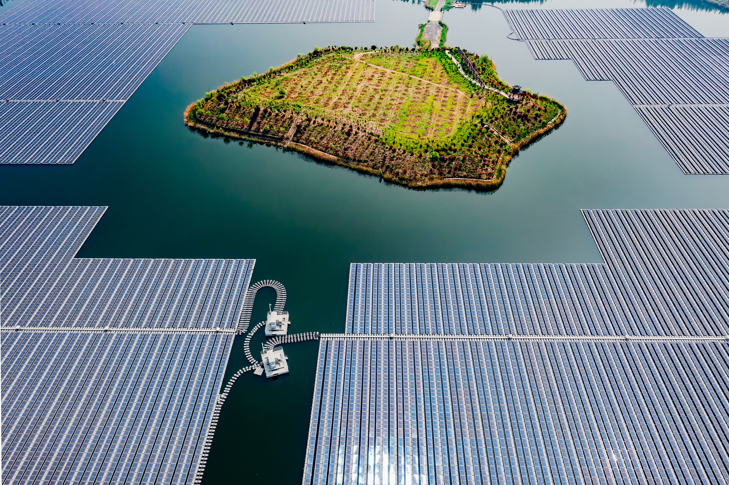 站在位于济宁市兖州区兴隆庄镇的时代绿能“水上光伏”湖心岛,数十万块光伏组件串联巨型阵列在阳光的照耀下反射出光芒。作为采煤沉陷区光伏发电项目,“水上光伏”的顺利并网,对于山东省探索采煤沉陷区综合治理新模式,助力沉陷区“阳光”转型具有重要意义。“目前,兴隆庄光伏项目已完成317MW建设并投产。”时代绿能兴隆绿能光储项目负责人王爽爽表示,自并网以来,该项目日发电量最高纪录约260万度。昔日采煤留下的塌陷地,正被“绿色能量”充盈。