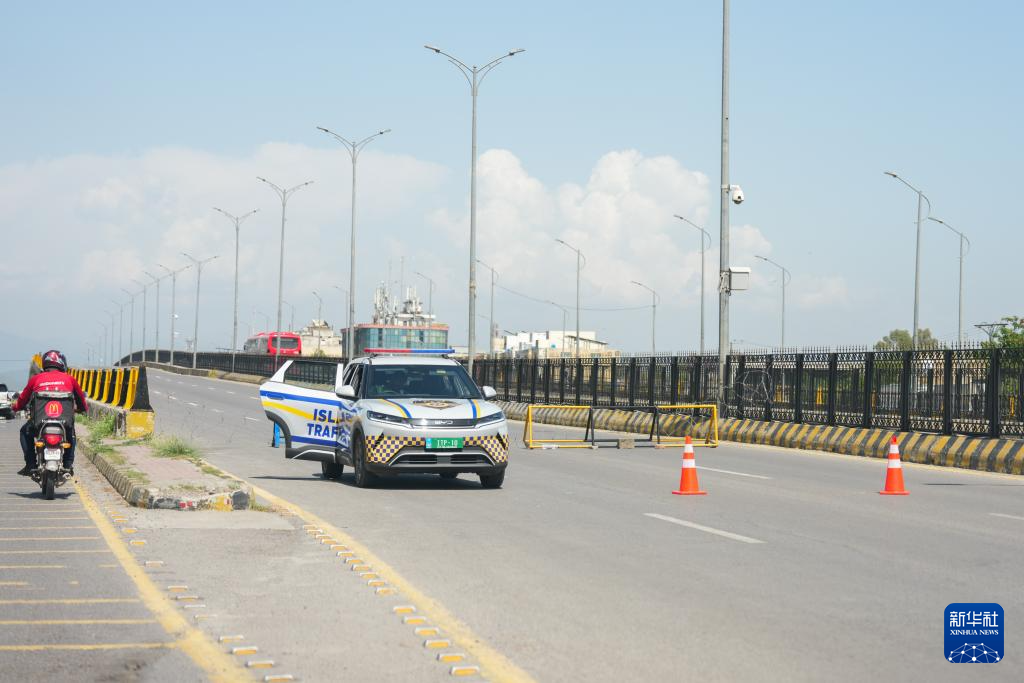 19日,在巴基斯坦首都伊斯兰堡,警察在一处布有路障的路口执勤。