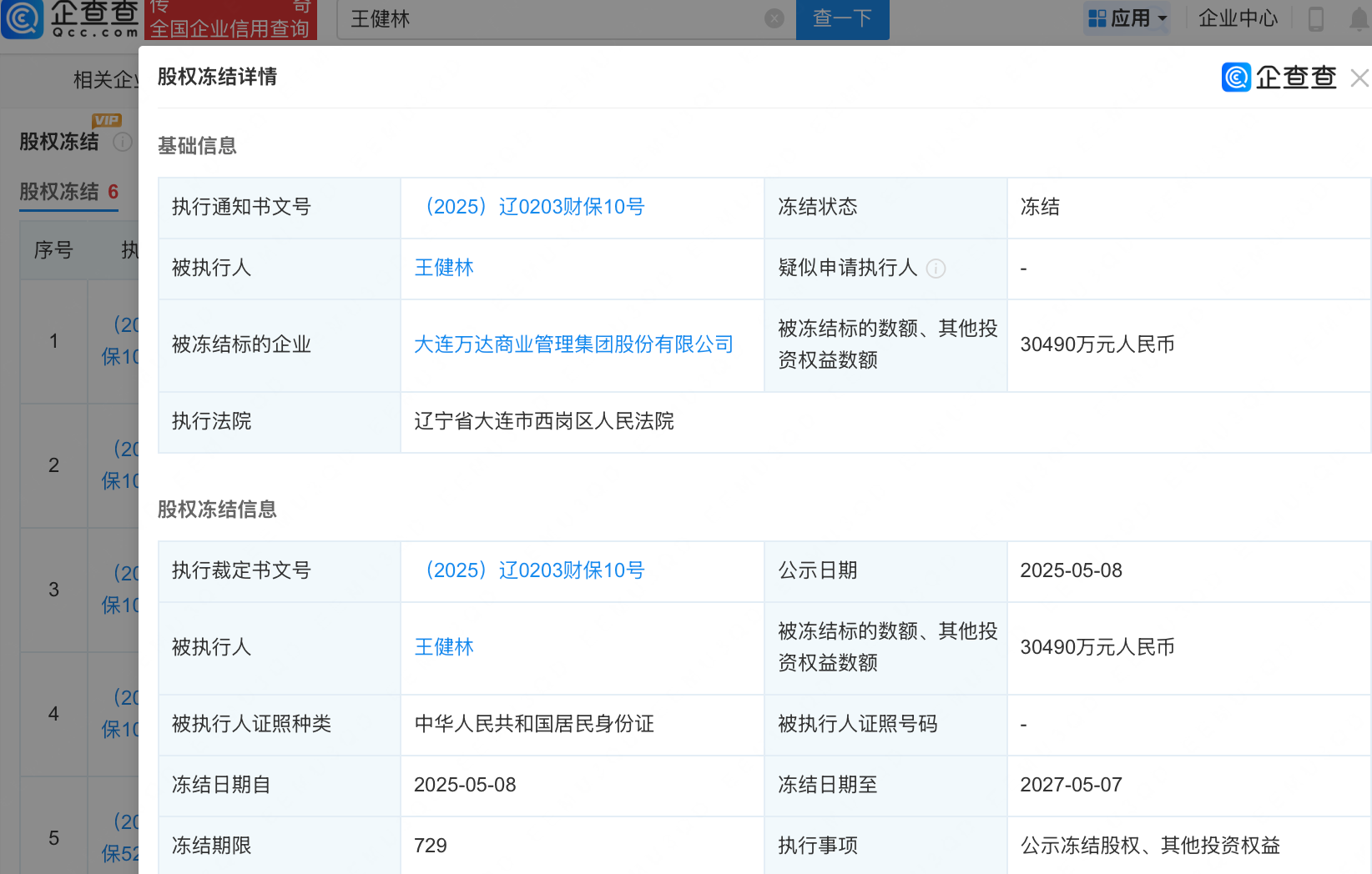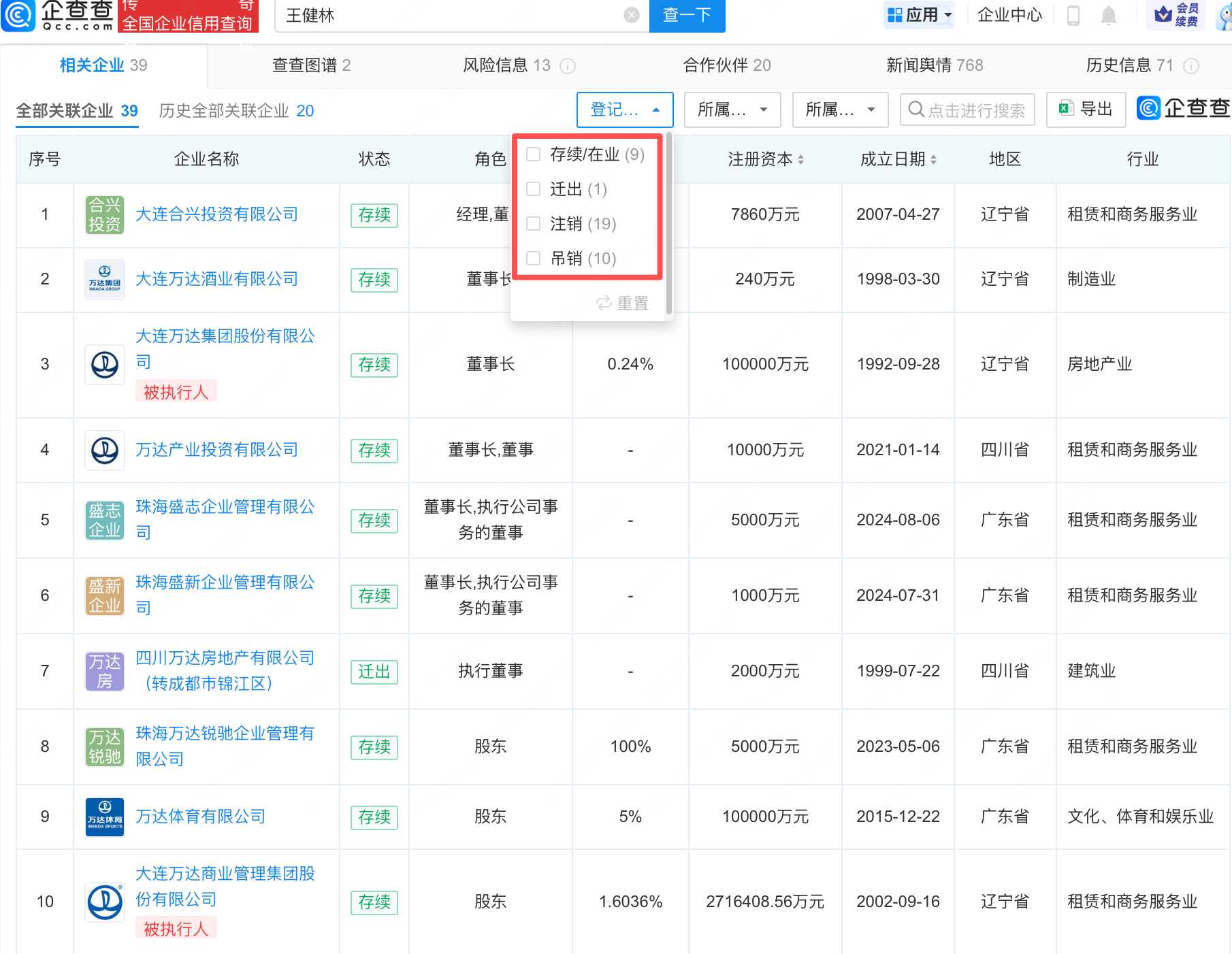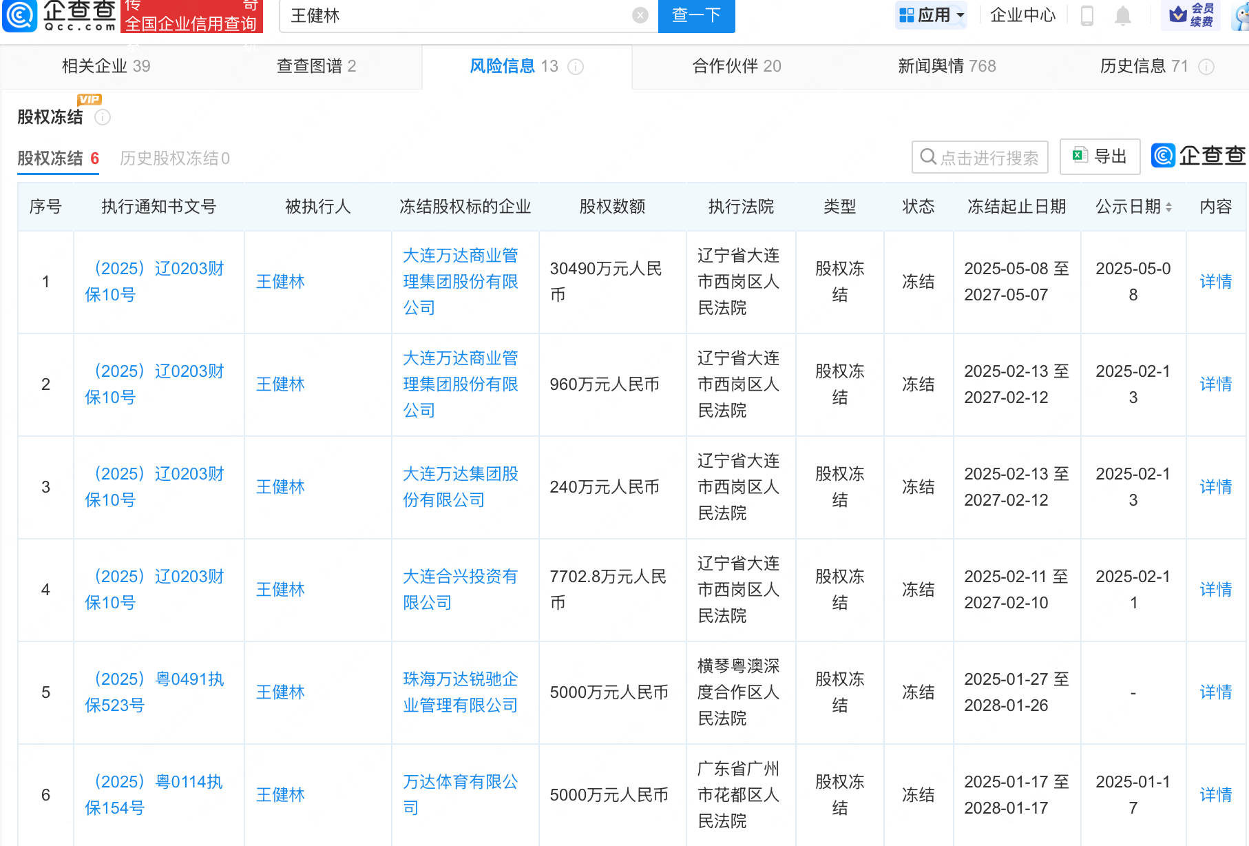 企查查APP显示,王健林名下关联30余家公司,目前仅9家存续、1家迁出,王健林在存续企业中担任经理、董事、董事长等职务。风信息显示,王健林目前仍有数亿元股权被冻结,其中其所持大连万达商业管理集团股份有限公司3.049亿元股权将冻结至2027年5月。