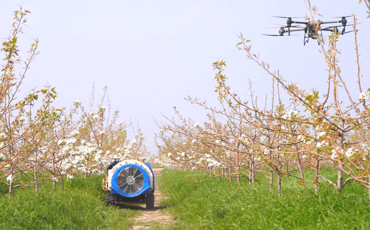 漫步梨园,高科技农业设施随处可见:细密的滴灌管网纵横交错,植保机器人在草地上来回穿梭,无人机在空中开展授粉作业,一幅现代化农业的生动图景跃然眼前。