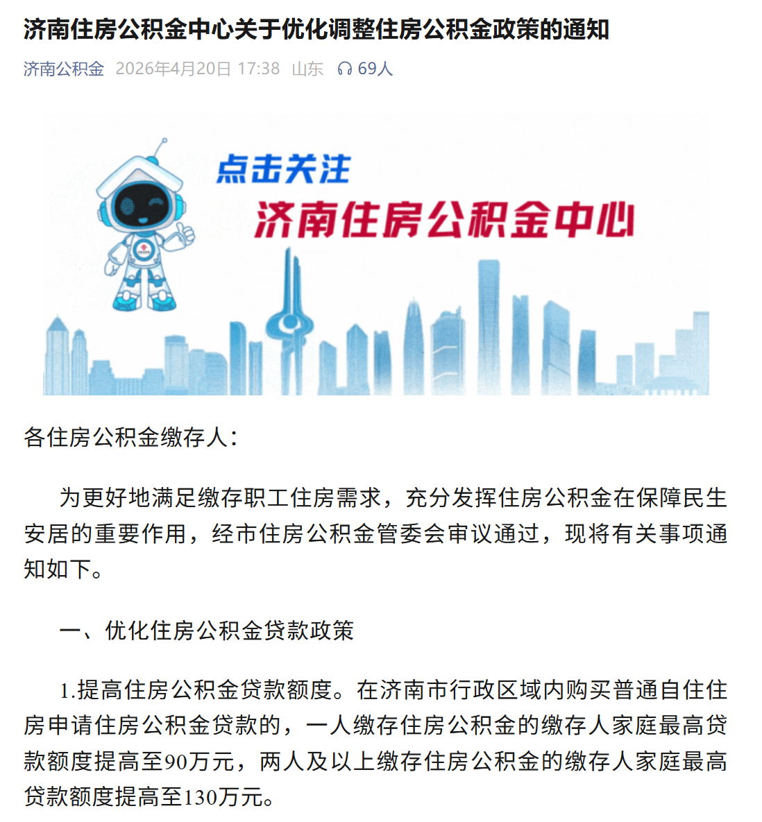 4月20日,济南住房公积金中心发布重磅优化新政,从贷款额度、住房套数认定、提取范围三个维度完成全方位升级。