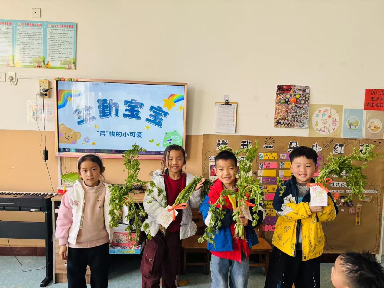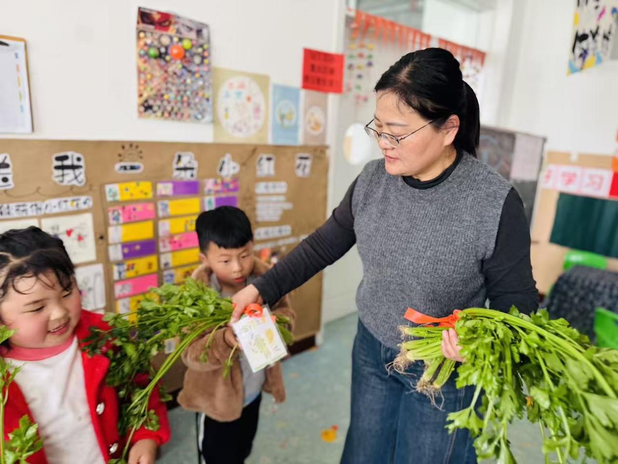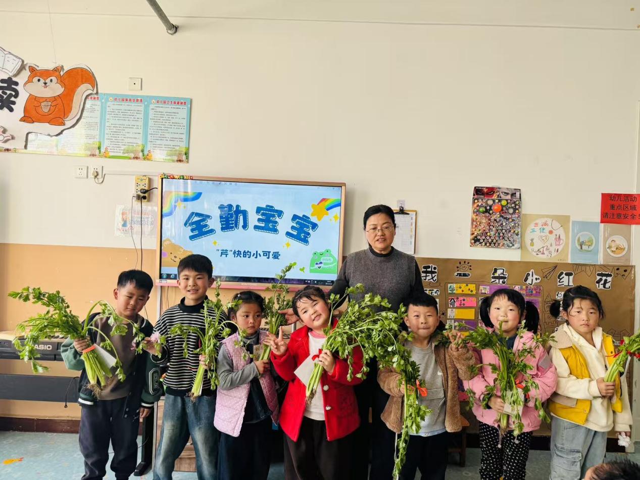 活动中,老师为每月坚持出勤的“全勤宝宝”们送上了带着美好寓意的芹菜小礼物,谐音“勤奋”,希望孩子们养成坚持的好习惯。收到礼物的孩子们脸上洋溢着开心的笑容,小小的芹菜不仅是一份奖励,更是对他们坚持与努力的肯定。