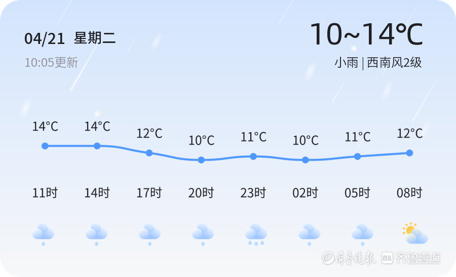 今天是星期二,4月21日,农历三月初五。菏泽市迎来小雨天气,气温在10℃到14℃之间,西南风2级,空气湿度为51%。空气质量状况良好,PM2.5指数为68,适合户外活动。市民出行时建议携带雨具,注意保暖,雨天路滑,请小心驾驶,确保安全。