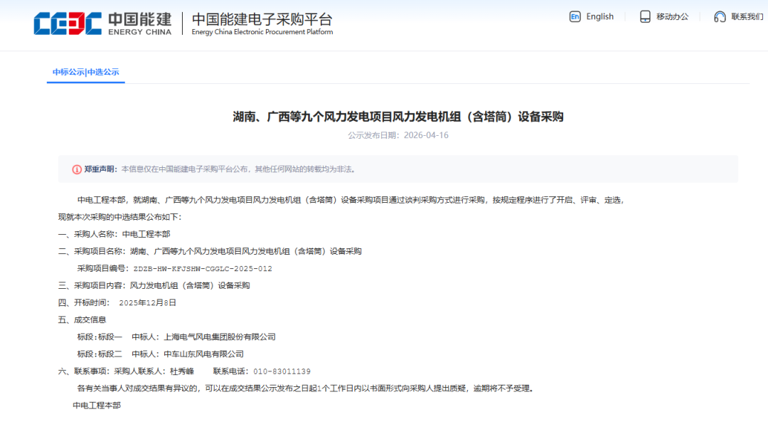 经济导报记者注意到,中国能源建设集团近日发布的9个风力发电项目风力发电机组设备采购结果显示,中车山东风电中标了其中一个标段。这一标段包含高峰一期、岩泊渡、黑龙江庆安、环县天池20万千瓦新能源、龙州大青山5个项目,拟装机总规模为517MW。