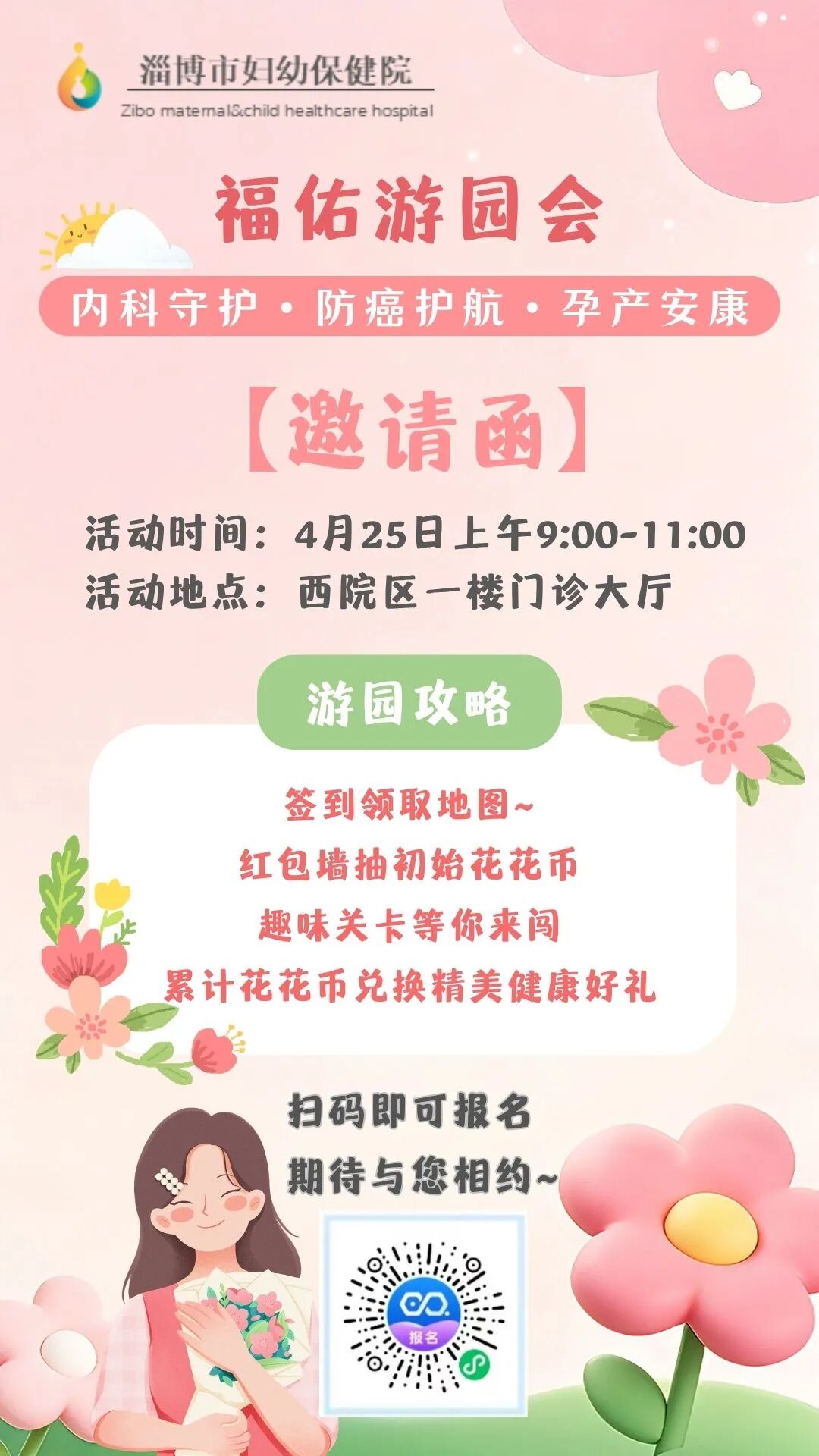 春日赴安康,医者护同行。淄博市妇幼保健院始终坚守妇幼公益初心,以医防融合、科普惠民为导向,把专业、暖心、便捷的健康服务送到群众身边。本次福佑游园会打破医疗科普壁垒,以趣味游园传递健康理念,以专科力量守护孕产安康、筑牢防癌防线、强化内科健康保障。市民可扫码或现场报名参与,相约4月25日淄博妇幼西院区,在春日美好时光里,收获健康知识、专业守护与满满惊喜,共筑幸福安康生活。