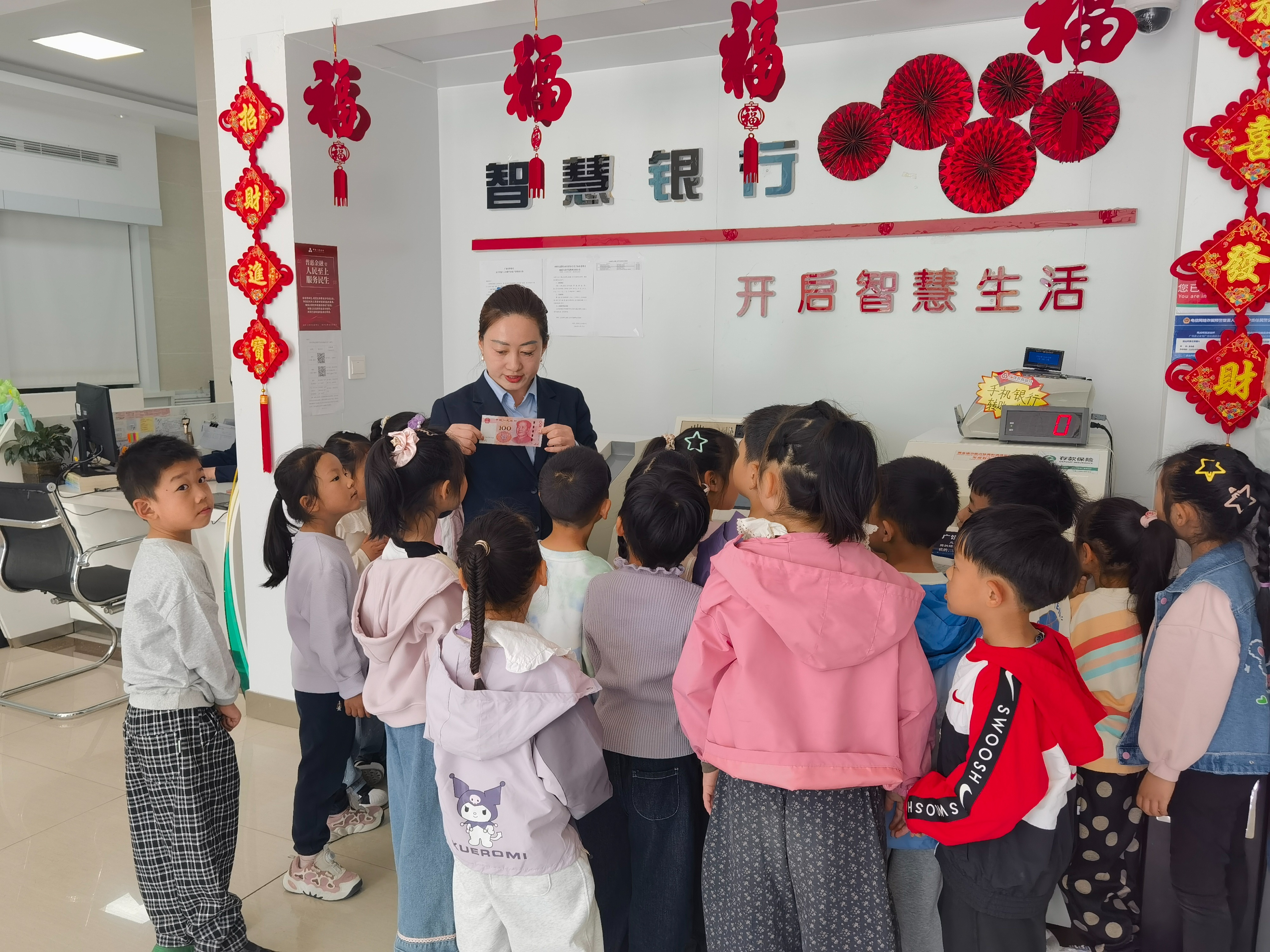 活动伊始,工作人员通过展示基础的柜面服务七步曲,揭开了银行工作的神秘面纱,大家在此环节中认真学习,一招一式有板有眼。紧接着,依次参观厅堂内的各个功能区域,了解自助机具的用途,孩子们还体验了智慧柜员机模拟存取款业务流程,沉浸式过了一把“银行瘾”。