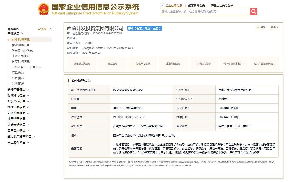 国家企业信用信息公示系统显示,西藏开发投资集团有限公司成立于2013年,注册资本200000万元人民币,法定代表人为祁腾武。