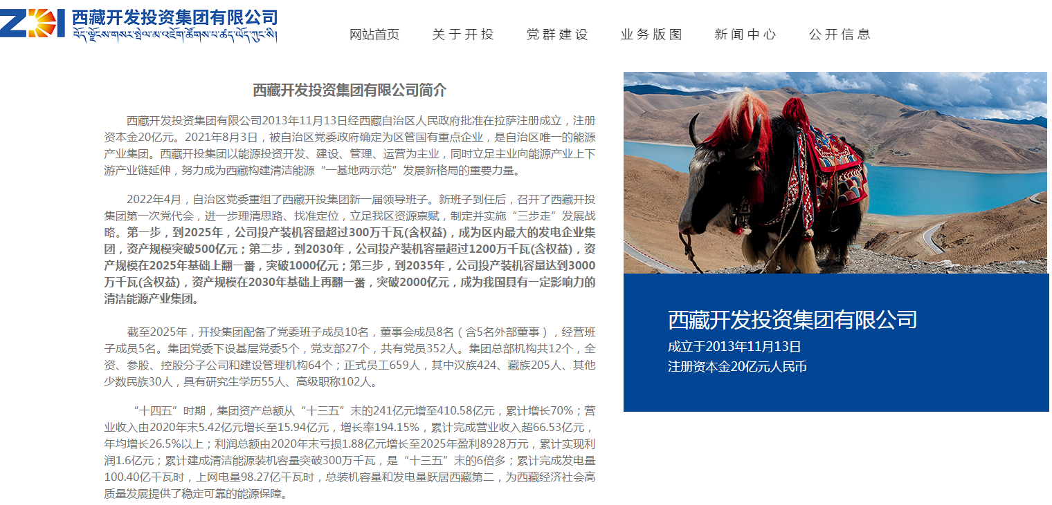 据西藏开投官方网站介绍,公司以能源投资开发、建设、管理、运营为主业,同时立足主业向能源产业上下游产业链延伸。“十四五”时期,集团资产总额从“十三五”末的241亿元增至410.58亿元,累计增长70%;营业收入由2020年末5.42亿元增长至15.94亿元,增长率194.15%,累计完成营业收入超66.53亿元,年均增长26.5%以上;利润总额由2020年末亏损1.88亿元增长至2025年盈利8928万元,累计实现利润1.6亿元。
