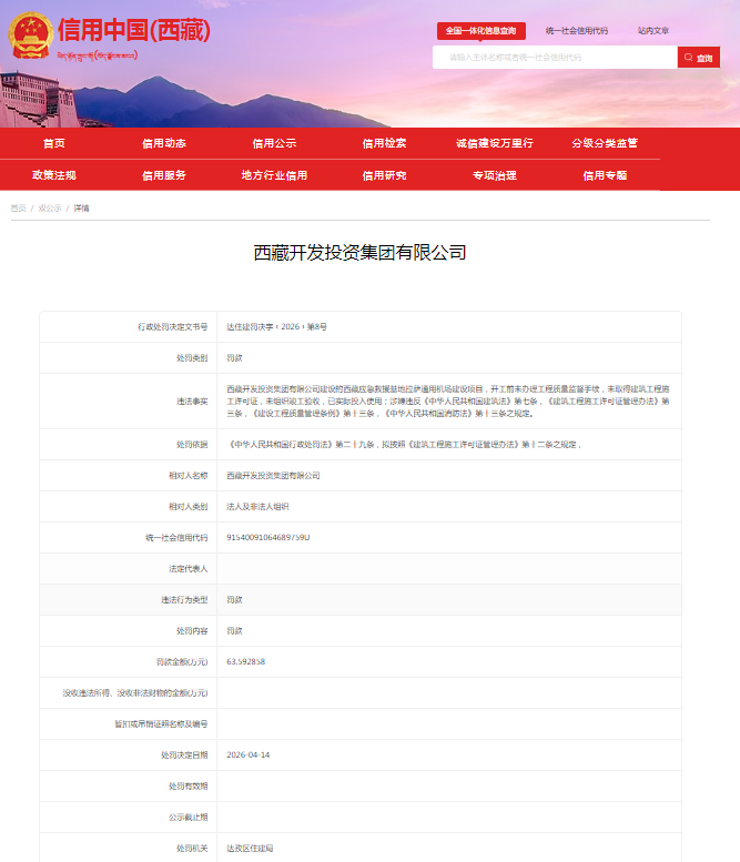 齐鲁晚报·齐鲁壹点记者于信用中国(西藏)双公示栏获悉,4月14日,西藏开发投资集团有限公司(下称“西藏开投”)被行政处罚,罚款金额63.592858万元,处罚机关是达孜区住建局。
