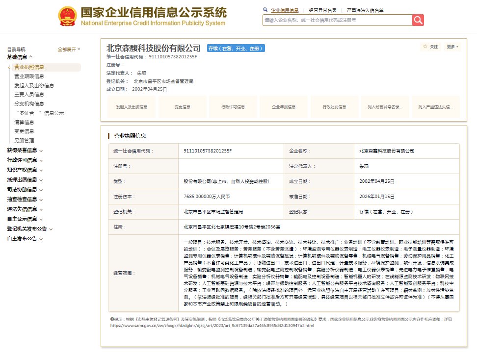 国家企业信用信息公示系统显示,北京森馥科技股份有限公司成立于2002年,法定代表人朱琨,注册资本7685万元人民币。