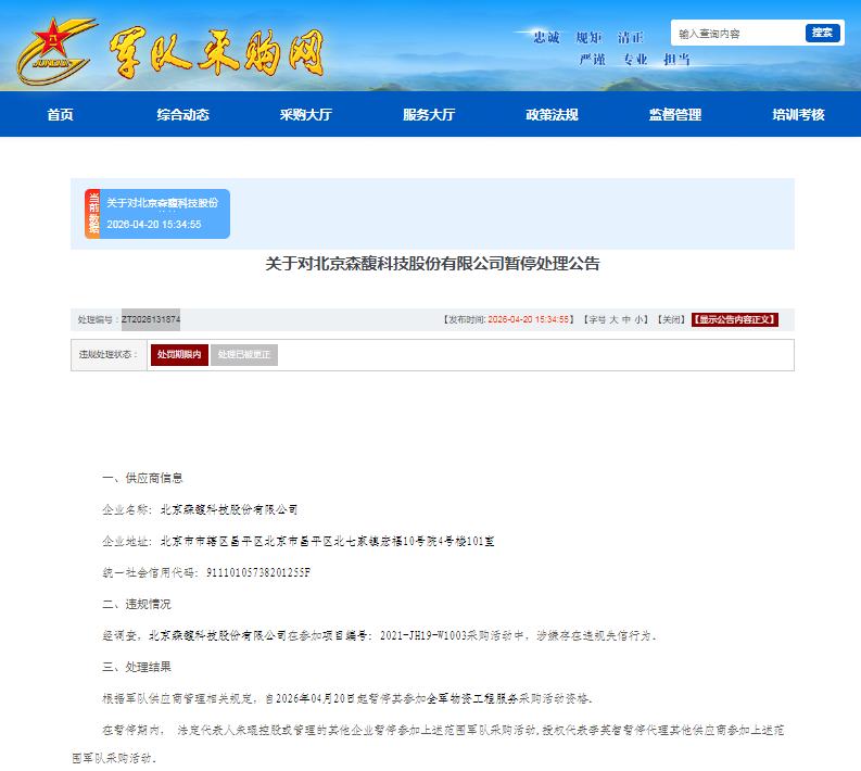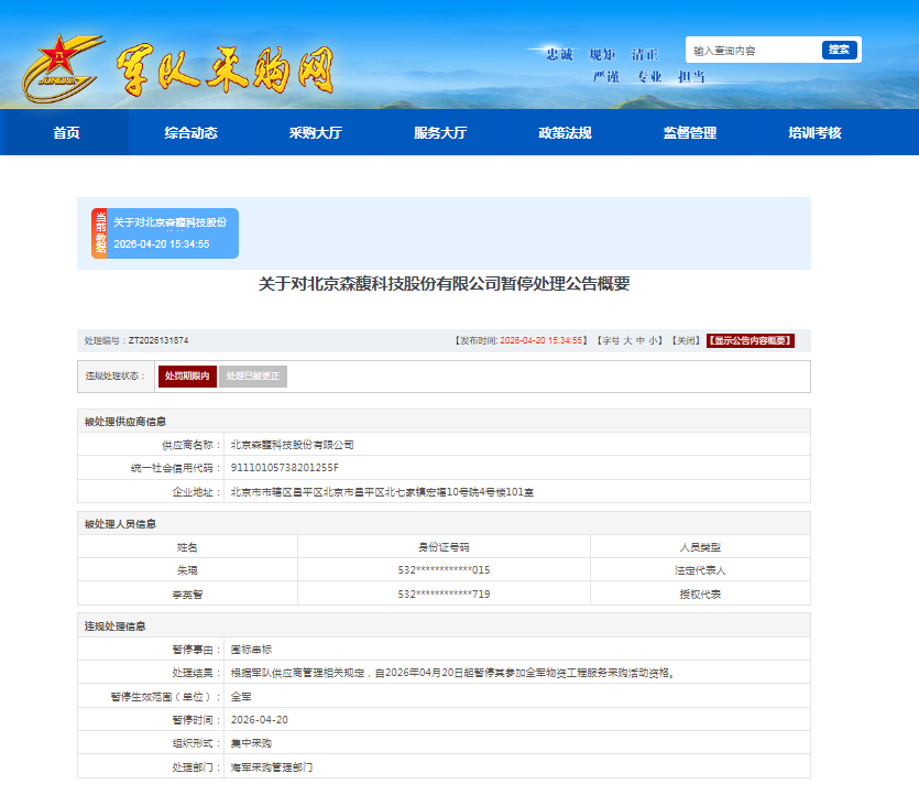 据悉,处理部门根据军队供应商管理相关规定,自2026年4月20日起暂停其参加全军物资工程服务采购活动资格。在暂停期内,其法定代表人朱琨控股或管理的其他企业暂停参加上述范围军队采购活动,授权代表李英智暂停代理其他供应商参加上述范围军队采购活动。处理编号:ZT2026131874。违规处理状态:处罚期限内。