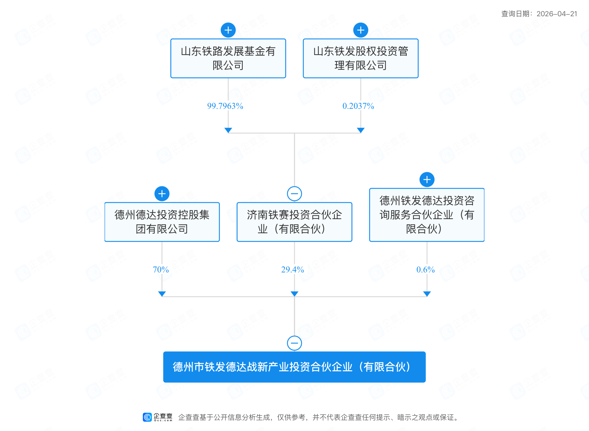 德州市铁发德达战新产业投资合伙企业(有限合伙)成立于3月30日,出资额5亿元。合伙人出资比例显示,德州德达投资控股集团有限公司、济南铁赛投资合伙企业(有限合伙)、德州铁发德达投资咨询服务合伙企业(有限合伙)分别占70%、29.4%、0.6%,德州铁发德达投资咨询服务合伙企业(有限合伙)担任执行事务合伙人。