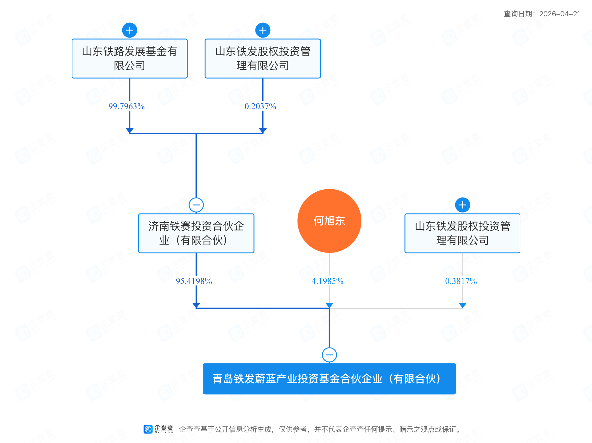 4月16日,青岛铁发蔚蓝产业投资基金合伙企业(有限合伙)在青岛注册成立,出资额2.62亿元。合伙人出资比例显示,济南铁赛投资合伙企业(有限合伙)、何旭东、山东铁发股权投资管理有限公司分别占95.42%、4.20%、0.38%,山东铁发股权投资管理有限公司担任执行事务合伙人。