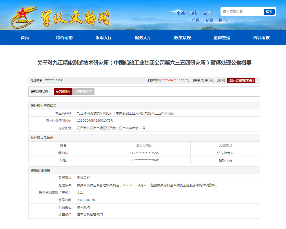 4月20日,军队采购网发布关于对九江精密测试技术研究所(中国船舶工业集团公司第六三五四研究所)暂停处理公告概要。处理编号:ZT2026131891显示,该单位被暂停事由是围标串标,根据军队供应商管理相关规定,自2026年4月20日起暂停其参加全军物资工程服务采购活动资格。