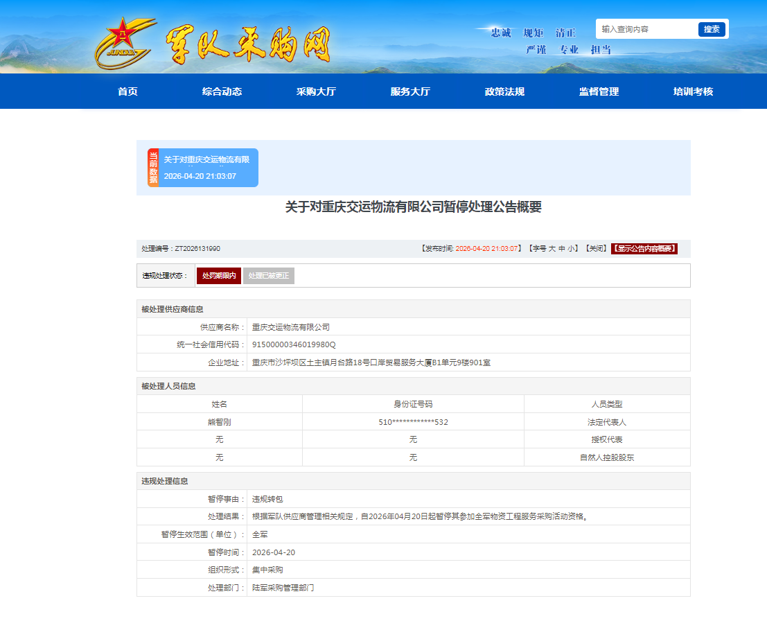 4月20日,军队采购网发布关于对重庆交运物流有限公司暂停处理公告。处理编号:ZT2026131990显示,经调查,重庆交运物流有限公司在参加项目编号:178-BZ2000401556AF采购活动中,涉嫌存在违规失信行为,暂停事由为违规转包。