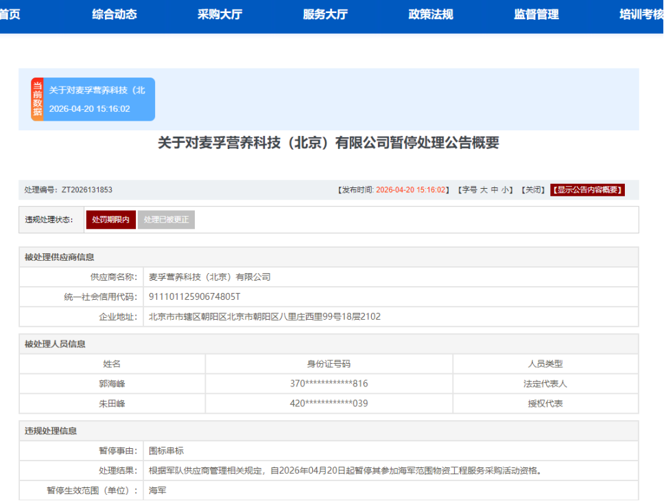 4月20日,军队采购网发布处理公告,麦孚营养科技(北京)有限公司在参加军队采购活动中,涉嫌围标串标,根据军队供应商管理相关规定,自2026年04月20日起暂停其参加海军范围物资工程服务采购活动资格。