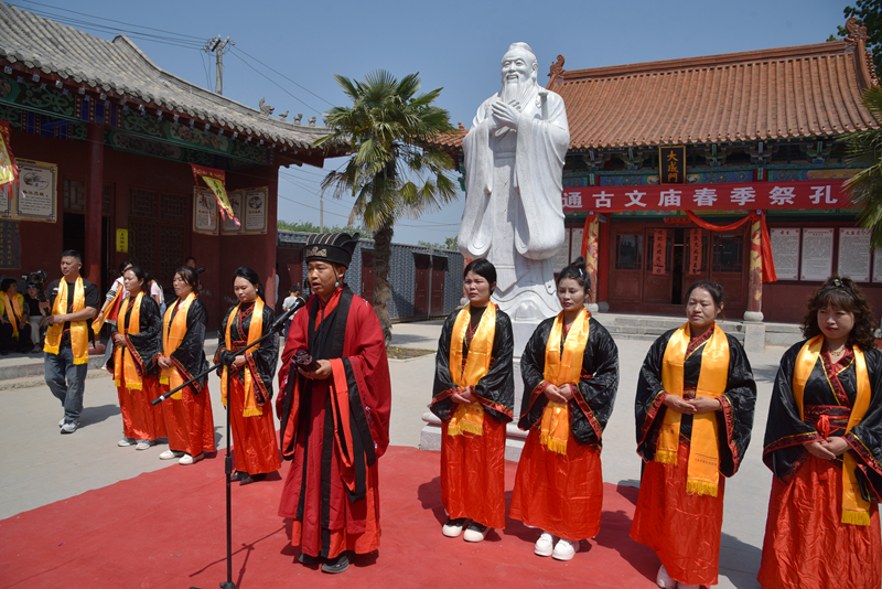 通古文庙作为菏泽市历史建筑、中国孔庙保护协会会员单位,是鲁西南地区传承儒家文化、举办传统祭典的重要场所。通古文庙祭孔活动沿袭春秋两祭传统,至今已连续举办四十三届。二十余年来,当地儒学研究会以庙会为平台,持续推动经典诵读、书画交流、乡贤表彰、戏曲展演等系列活动,不仅活化利用了文庙空间,还赋予古老的传统庙会崭新内涵,使通古文庙成为了远近闻名的文化旅游景点,为传播儒家文化、促进乡村文明建设作出了积极贡献。实现“古庙焕新辉,德风化雨润人心”的传承效果。