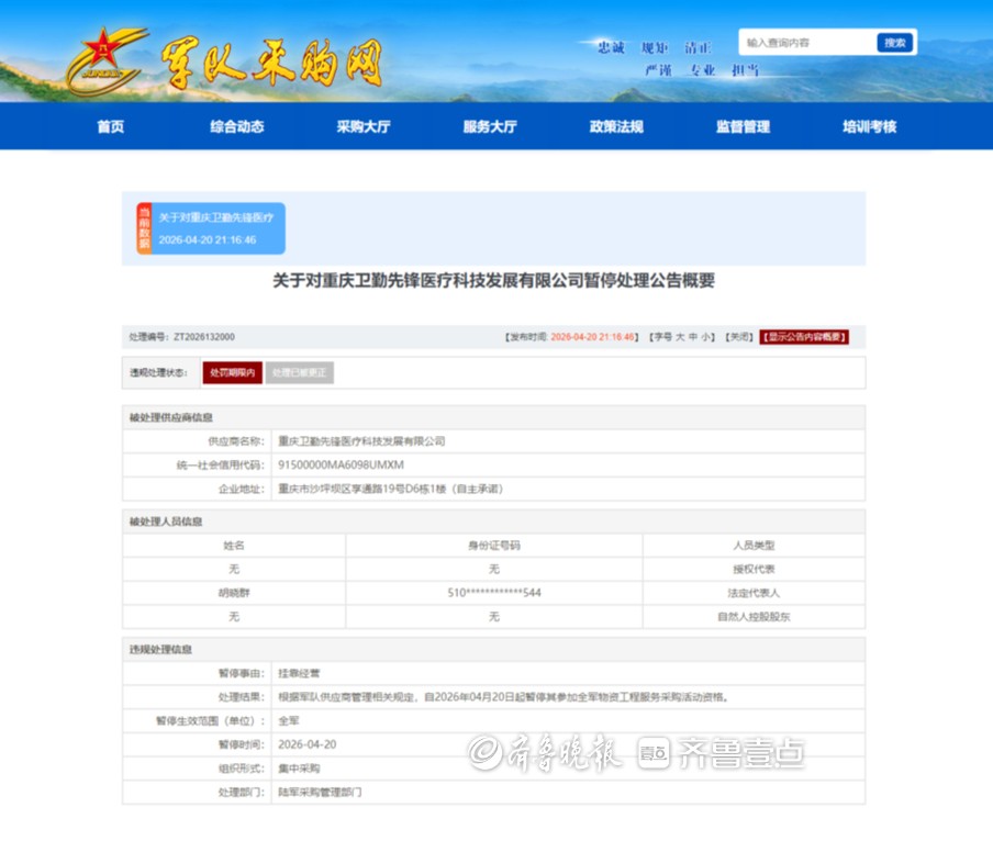 近日,陆军采购管理部门发布处理公告,重庆卫勤先锋医疗科技发展有限公司因挂靠经营,被暂停参加全军物资工程服务采购活动资格。