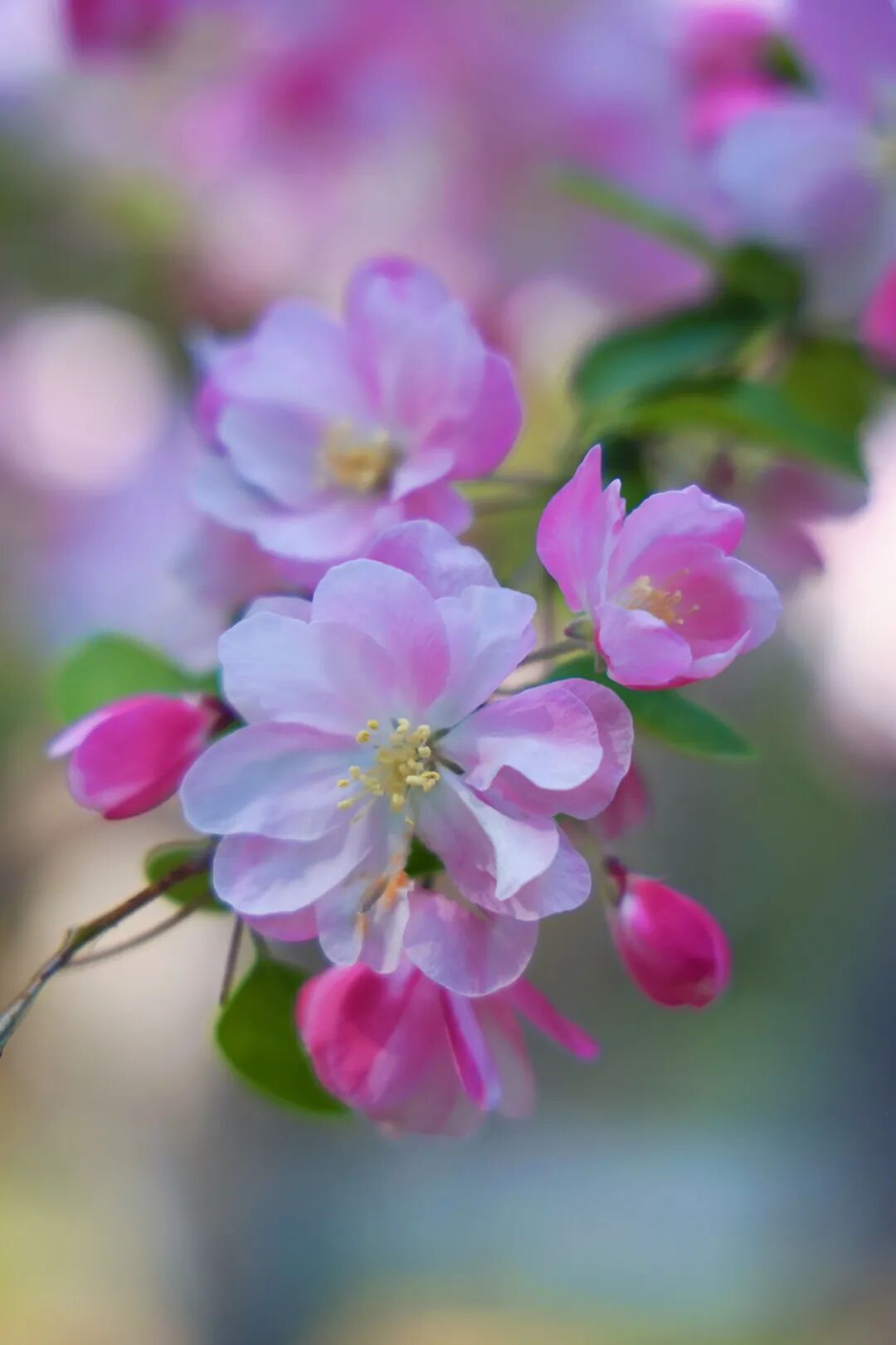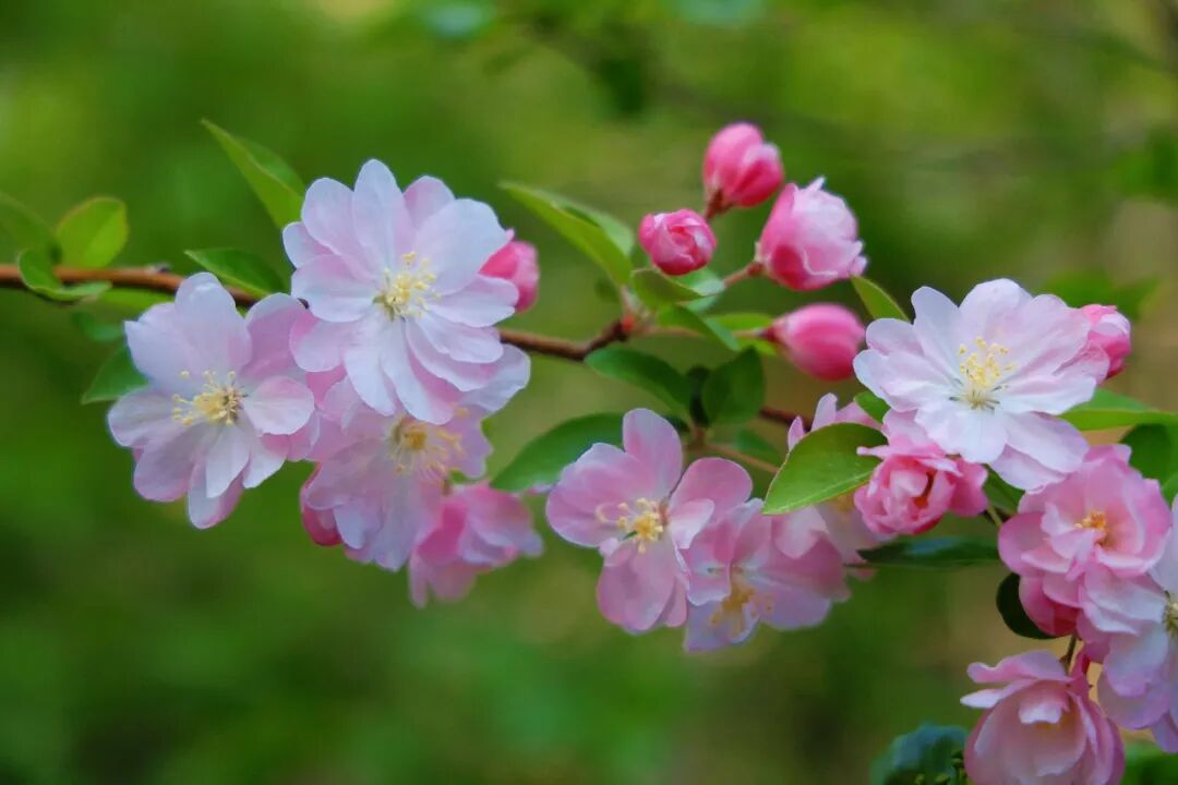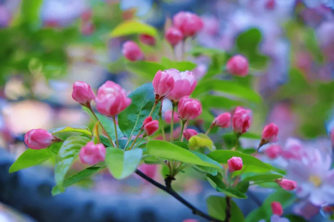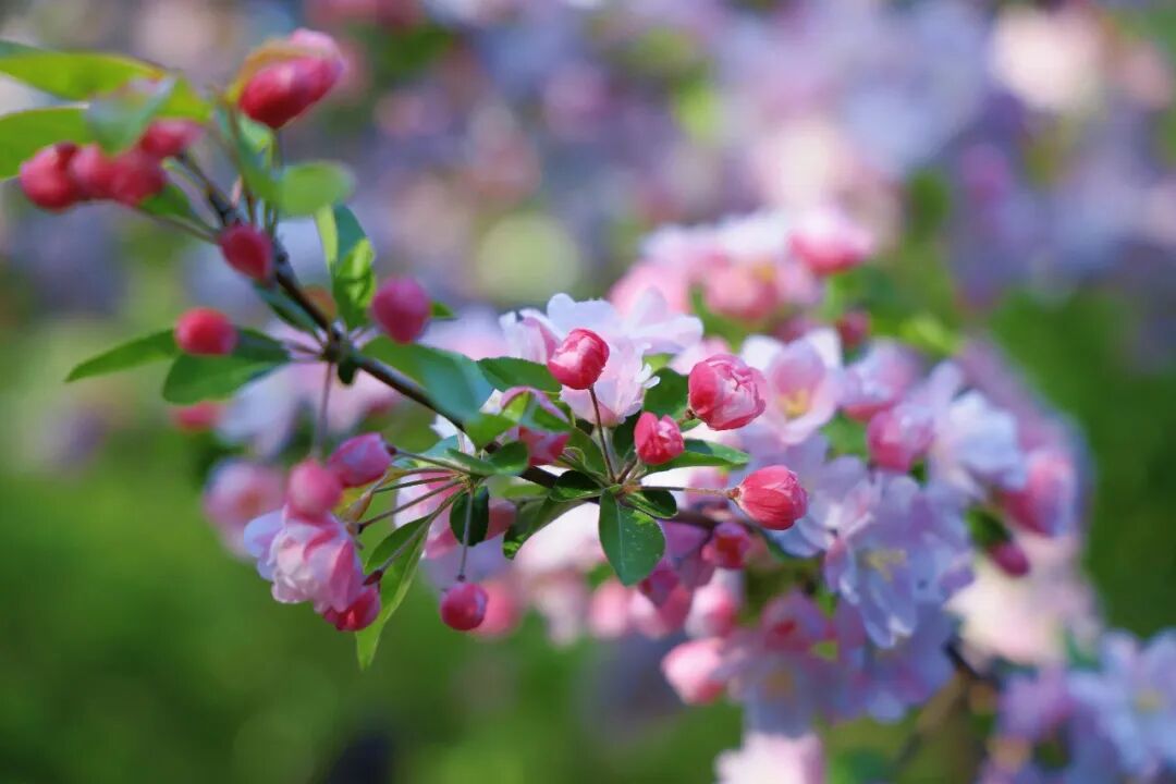 不同于樱花的清冷、桃花的艳丽,海棠花的花苞是浓艳的胭脂红,绽开后从深粉晕染到浅白,渐变的色彩像被春日晕染开的水彩,温柔又灵动。
