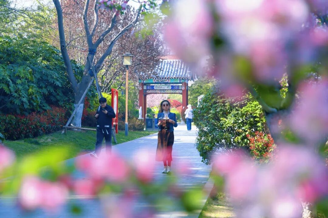 从环翠楼公园正门登上第一段台阶,往左手边望去,一排海棠繁花满缀、肆意盛放,铺就出一条浪漫又治愈的春日小径。
