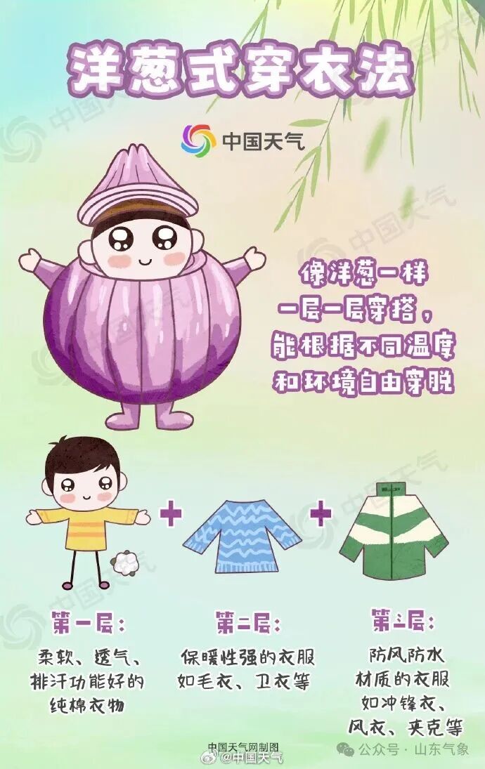 气温变化时,可以选择“洋葱式”穿搭,方便根据天气冷热增减外套,外出重点保护颈部、腹部、脚部、头部等易受凉部位,佩戴好帽子、围巾、手套。