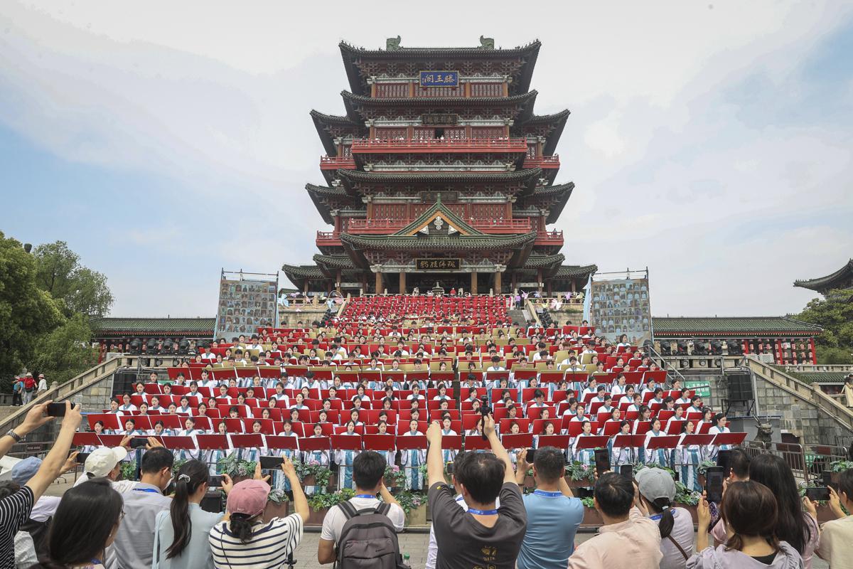 Students in traditional costumes recite the Preface to the Pavilion of Prince Teng by Tang Dynasty (618-907) poet Wang Bo, in front of the Tengwang Pavilion in Nanchang, Jiangxi province, on Monday. The fifth National Conference on Reading is being held from Monday to Wednesday in Nanchang, marking the launch of the first National Reading Week. LIU LIXIN/CHINA NEWS SERVICE