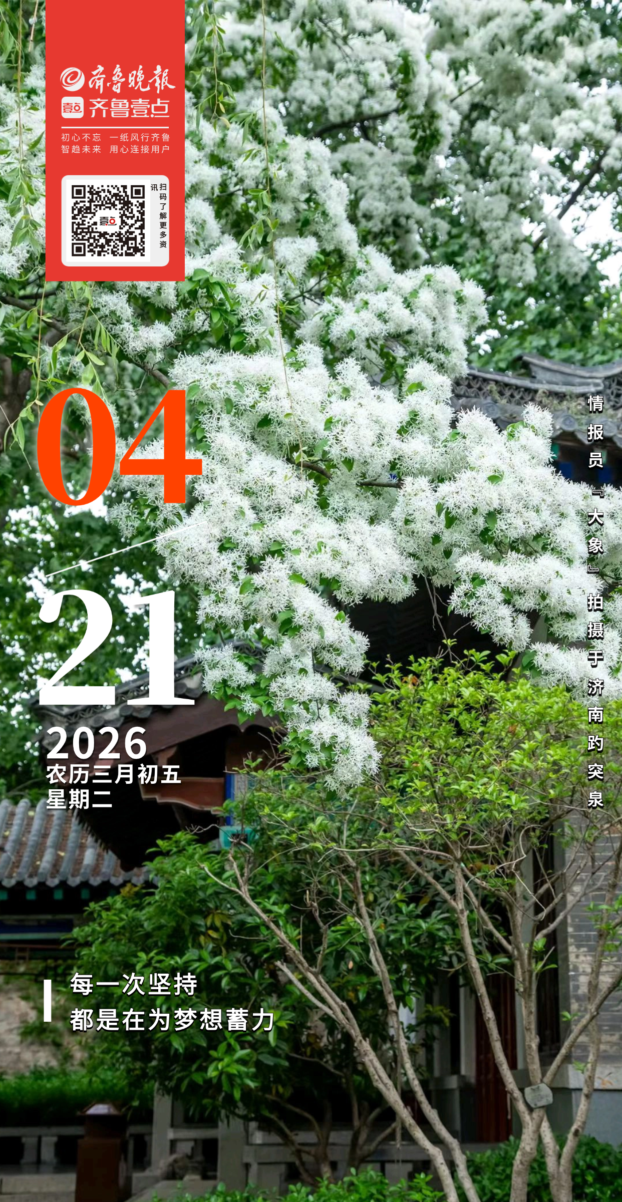 济南趵突泉畔,流苏花如云堆雪,开得满园馨香。风一吹,细碎的白花簌簌落下,像春日里的一场温柔雪,轻覆在黛瓦飞檐上。花影摇曳,连时光都慢了下来,把这济南的春日,酿成了一场让人一眼就醉的清梦。