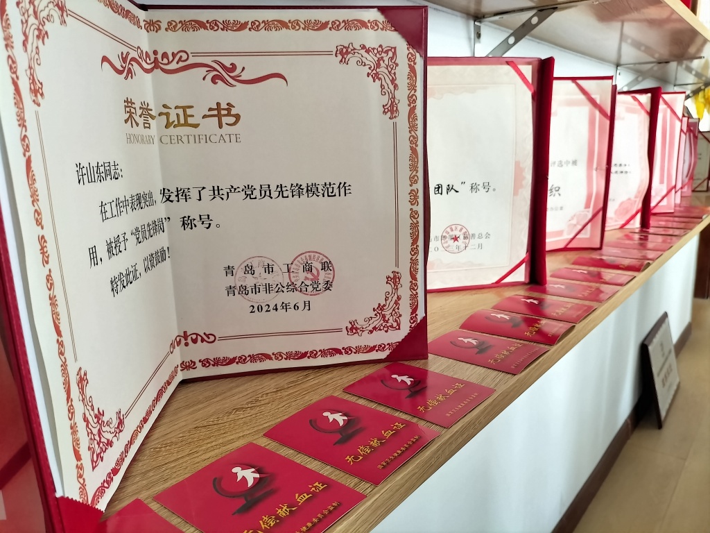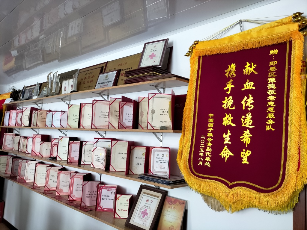 在豫德许氏修脚旗舰店会议室内,一面面锦旗、一本本荣誉证书整齐陈列。全国无偿献血奉献奖金奖、山东省“十大孝星”提名奖、青岛市“文明市民”“十大孝星”以及“党员先锋岗”“最美家乡人”……这些荣誉不仅见证了许山东与团队的奉献与坚守,更不是终点,而是他继续前行的动力,也成为感召更多人投身公益的旗帜。