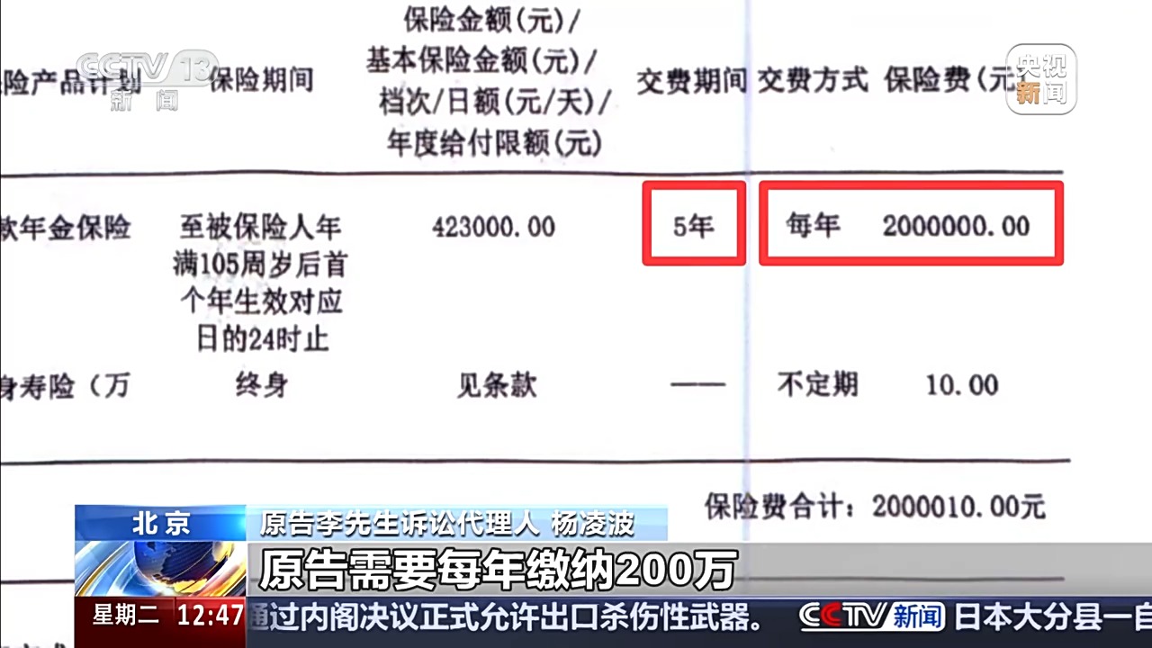 杨凌波:按照保险合同的规定,原告需要每年缴纳200万元,连续缴纳5年也就是要缴纳1000万元。在投保人过世之后,这1000万元才能取出,就相当于原告在有生之年只能领取少量的利息,1000万元的巨额本金无法支出。