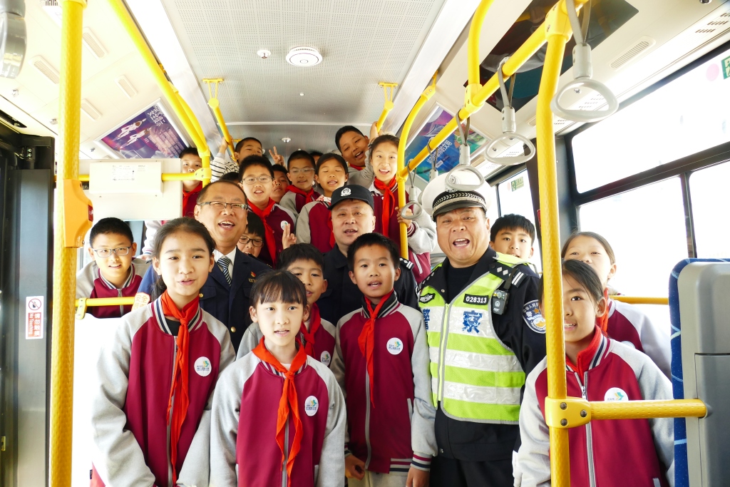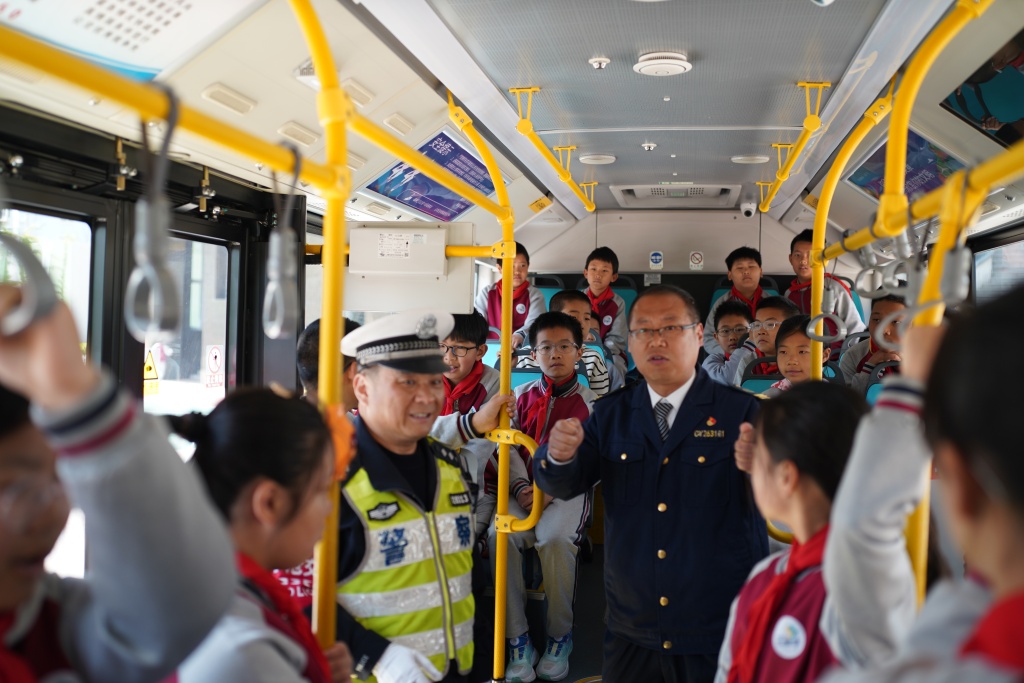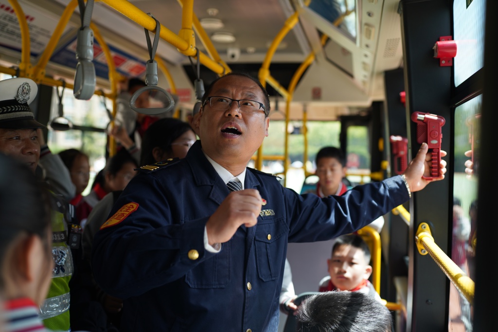 随后,孩子们登上公交巴士,开启针对性的安全实操学习。民警重点强调乘车安全规范,明确禁止在车上食用糖葫芦等带有尖锐长签的零食,防止紧急刹车时造成伤害;同时提醒孩子们,无座位时要抓牢扶手或吊环,切勿将头、手伸出窗外。特警大队民警唐斌同步传授防公交扒手、防陌生人搭讪的实用技巧,明确告知孩子们遇到危险可第一时间向公交驾驶员求助,进一步强化了孩子们的自我防范意识。李沧巴士驾驶员则为孩子们讲解逃生锤的用途,现场演示使用方法,并反复叮嘱无紧急情况切勿随意取下,帮助孩子们熟练掌握应急避险技能。