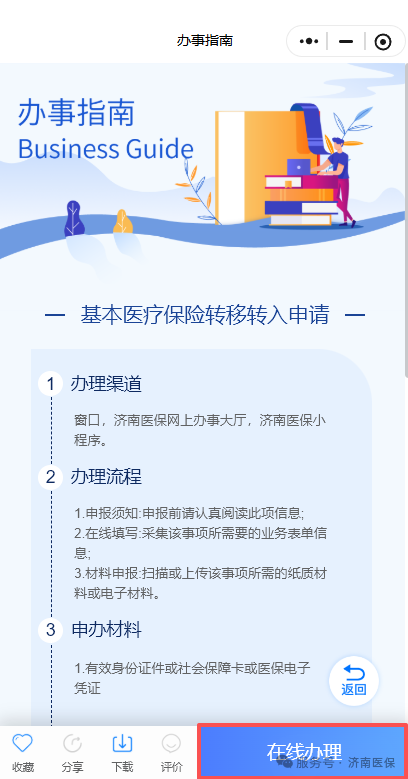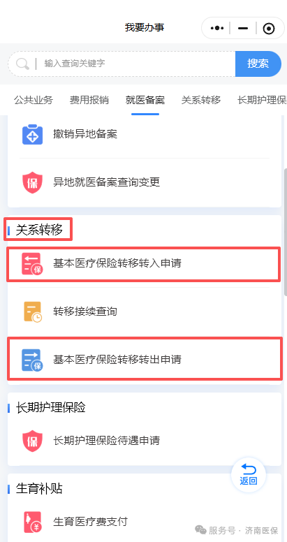 1.搜索“济南医保”微信或支付宝小程序,进入后点击“我要办事→基本医疗保险转移转出(或转入)申请”;