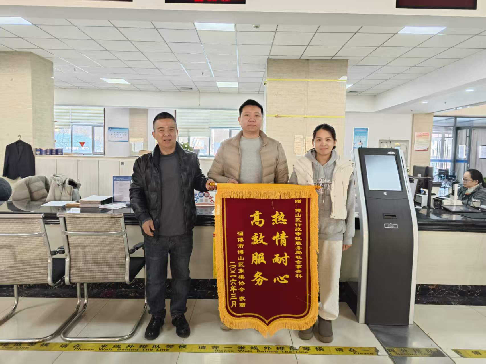 “热情耐心 高效服务”,4月21日,记者在淄博市博山区行政审批服务局看到这样一面锦旗。原来,这是淄博市博山区中国象棋协会筹备组的李先生日前专门送来的,目的就是感谢工作人员在协会成立全流程中专业高效、贴心暖心的服务。
