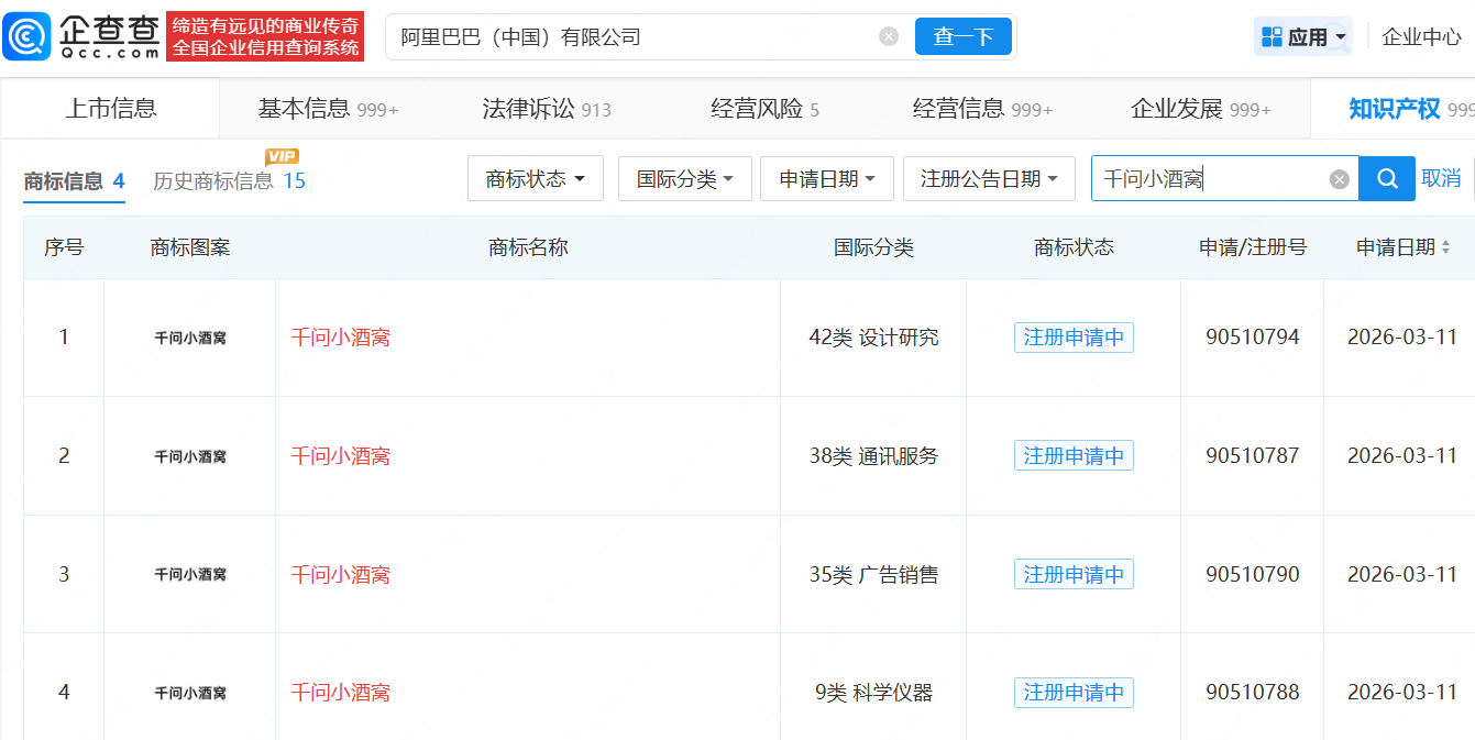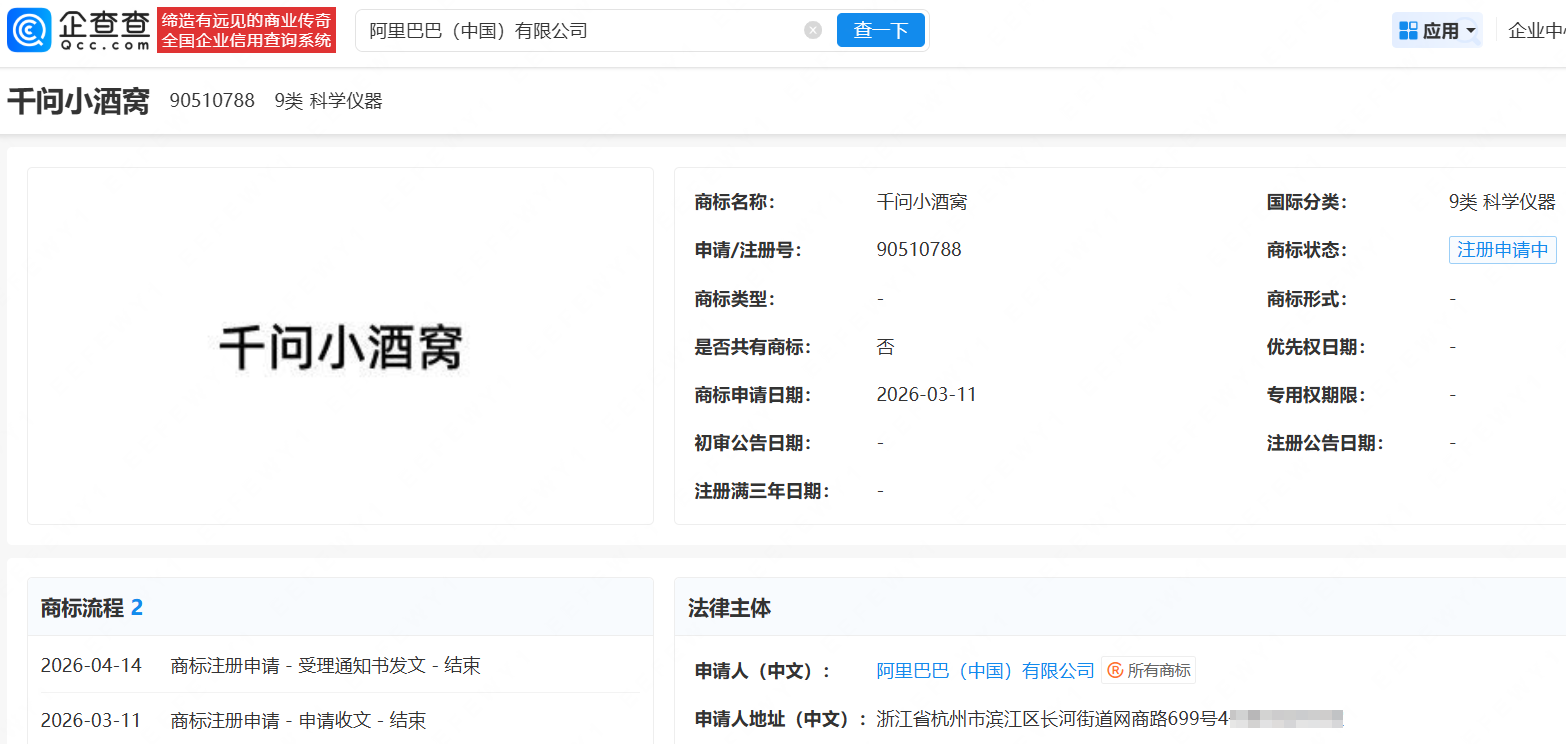 企查查APP显示,阿里巴巴(中国)有限公司近期申请多枚“千问小酒窝”的商标,涉及 AI、人形机器人等多个领域。