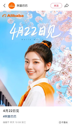 就在4月20日,阿里集团官方账号发布了一幅神秘海报,文案只有“4月22日见”,画面中是一位酒窝特征明显的女性形象。