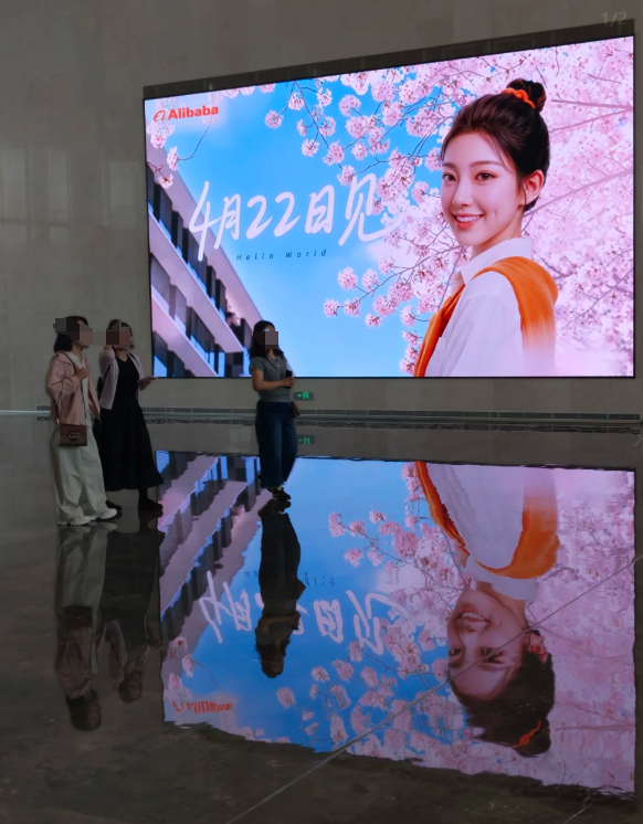 同日有网友爆料,阿里巴巴总部园区出现了一张巨幅海报。海报上一位扎着丸子头的女孩回眸一笑,露出两个酒窝,可爱又清新,旁边写着4月22日见,左上角还标着阿里巴巴的logo。