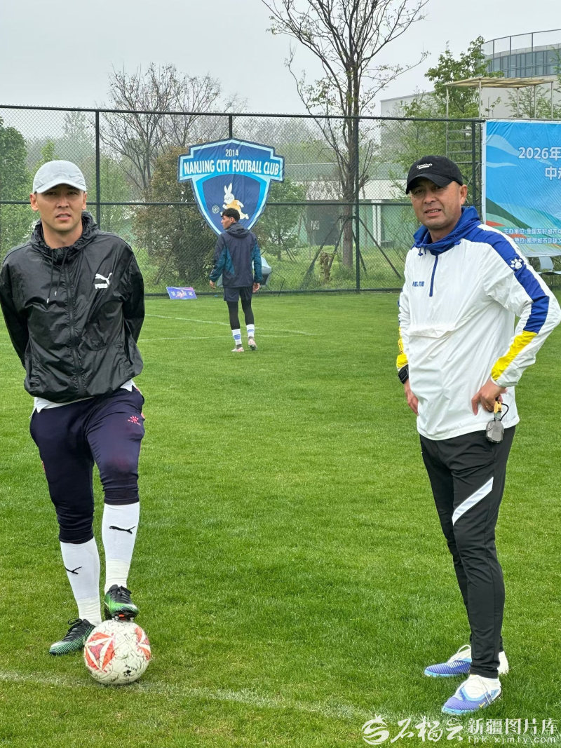 吾提库尔(左)在南京城市足球俱乐部训练基地。图由吾提库尔提供