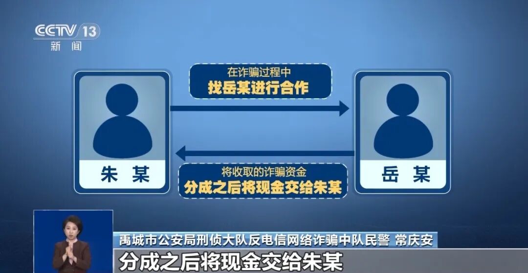 禹城市公安局刑侦大队反电信网络诈骗中队民警 常庆安:经过审讯发现,朱某和岳某不是同一个诈骗团伙,朱某在直播过程中只负责直播,岳某有自己的直播诈骗团队,以及相关的资金通道,朱某在诈骗过程中找岳某进行合作,岳某将收取的诈骗资金,分成之后将现金交给朱某。