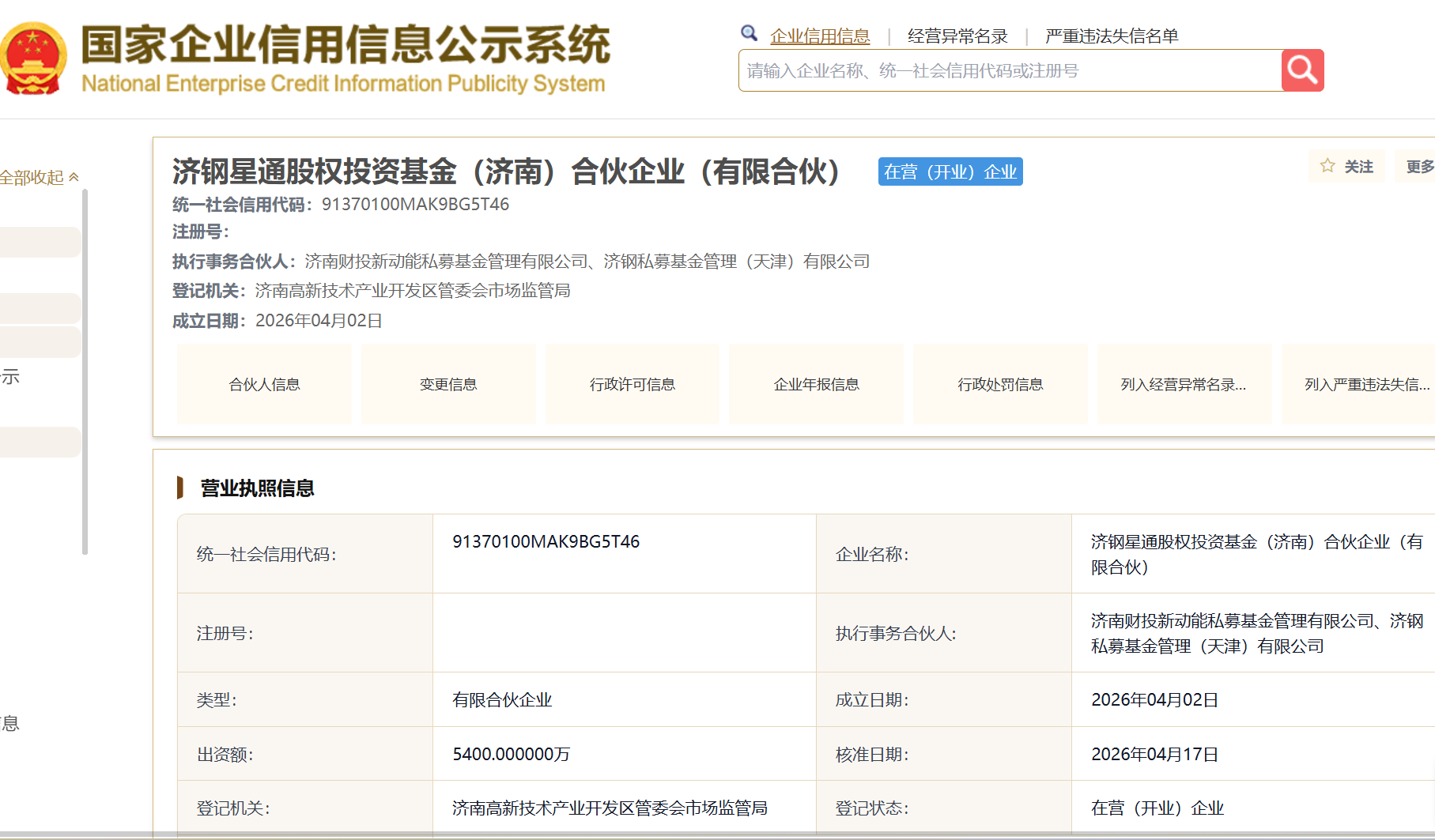 日前,企查查信息显示,刚成立半月的济钢星通股权投资基金(济南)合伙企业(有限合伙)(下称“济钢星通基金”)发生工商变更。