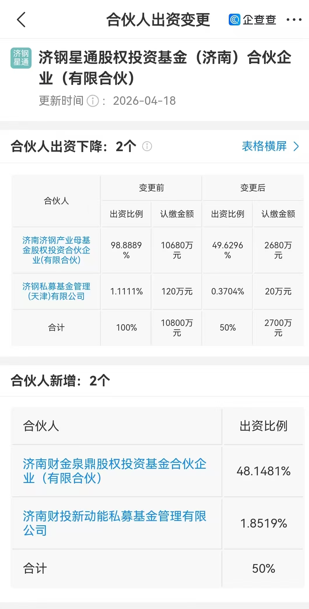 变更后,济钢星通基金的出资总额降至5400万元。济钢产业母基金、济钢私募天津公司的出资总额降至2700万元,合计出资比例由100%降低至50%;剩余的50%股权,由新增合伙人济南财金泉鼎股权投资基金合伙企业(下称“财金泉鼎基金”)和济南财投新动能私募基金管理有限公司(下称“新动能私募基金”)接盘。