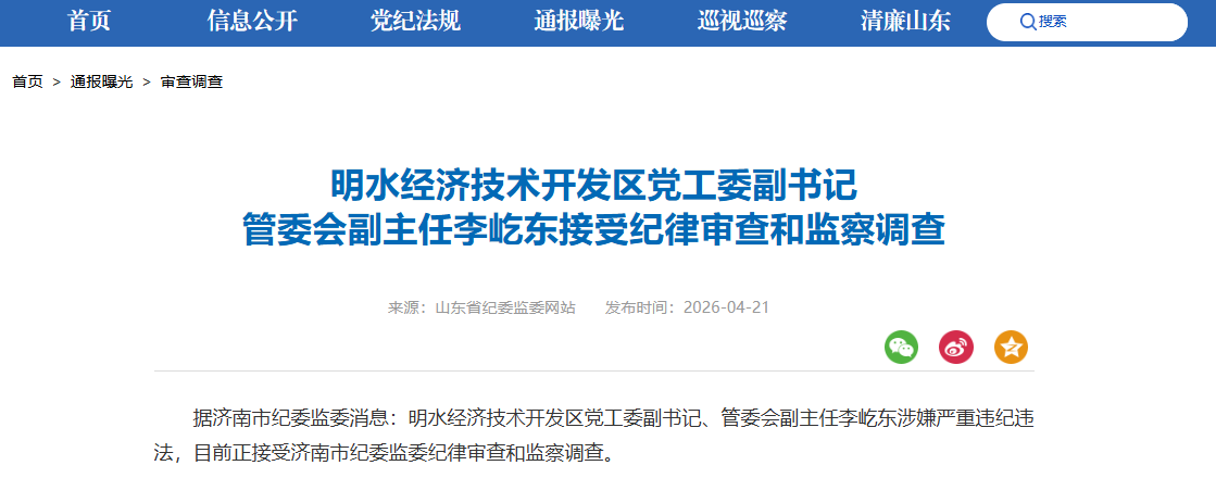 4月21日,据济南市纪委监委消息:明水经济技术开发区党工委副书记、管委会副主任李屹东涉嫌严重违纪违法,目前正接受济南市纪委监委纪律审查和监察调查。