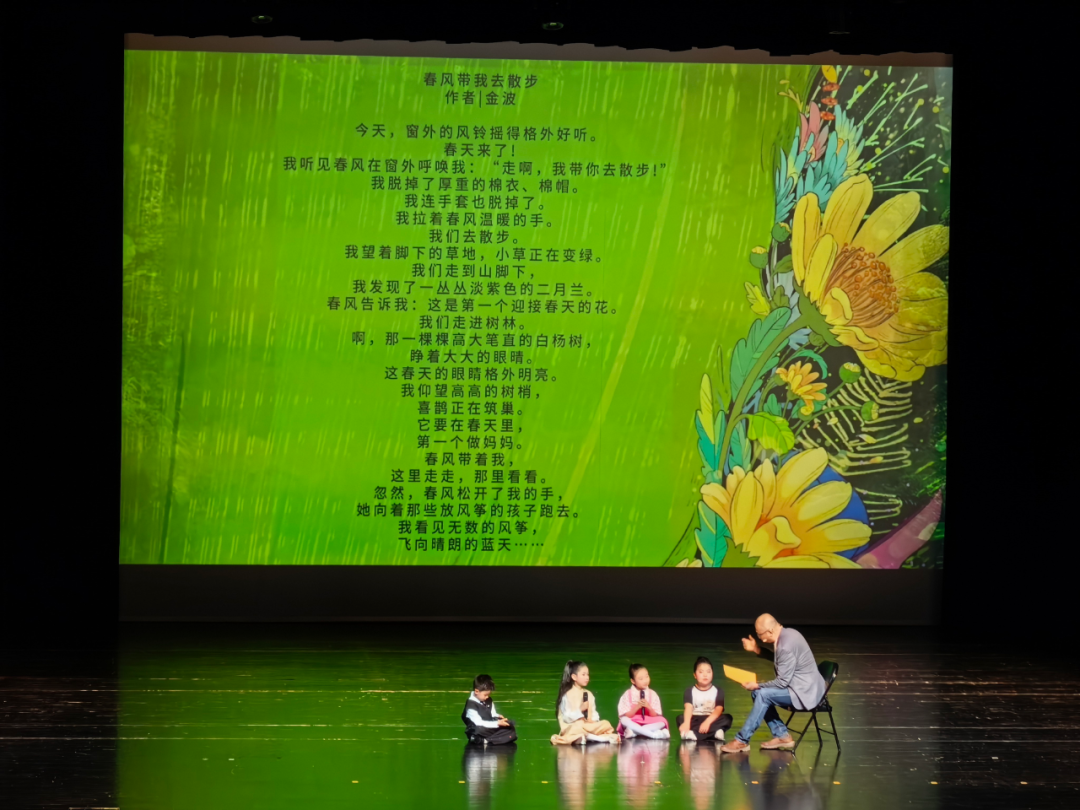 “春天里”篇章紧扣世界读书日,先后呈现《春江花月夜》《春天的交响》等诵读作品,师生亲子共读传递阅读温情。共创课堂以《春》为纽带实现全民参与,访谈环节解答家庭阅读难题,最后孙良教授与主持人带领济宁市养老指导服务中心三名孩子朗诵《让生命影响生命》,传递善意与温暖。