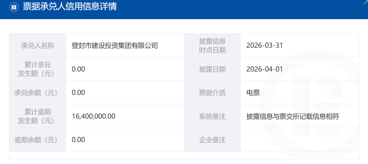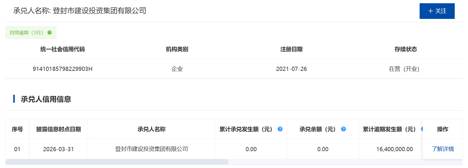 据上海票据交易所网站披露,截至3月31日,登封建投的票据承兑余额为0元,累计承兑发生额为0元;票据逾期余额为0元,累计逾期发生额为1640万元。