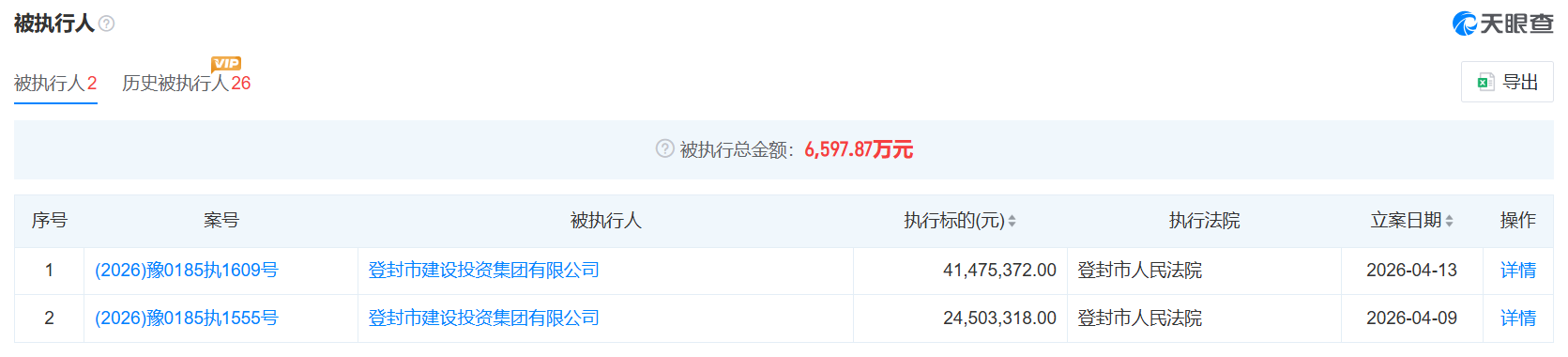 近期,登封市建设投资集团有限公司(以下简称“登封建投”)两次成为被执行人。4月9日,该公司被登封市人民法院立案执行,执行标的2450.33万元。4月13日,该公司再次被登封市人民法院立案执行,执行标的4147.54万元。