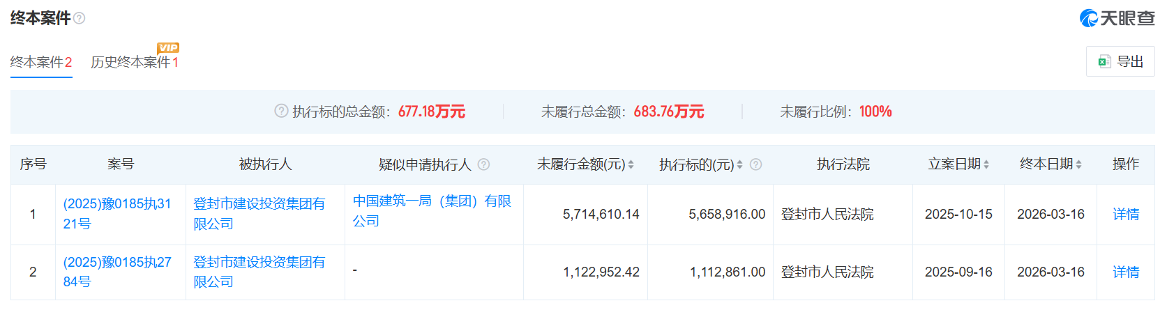天眼查显示,登封建投现存2条终本案件信息,执行标的总金额677.18万元,未履行总金额683.76万元,未履行比例100%。该公司及其法定代表人6次被法院限制高消费,涉案总金额565.89万元。