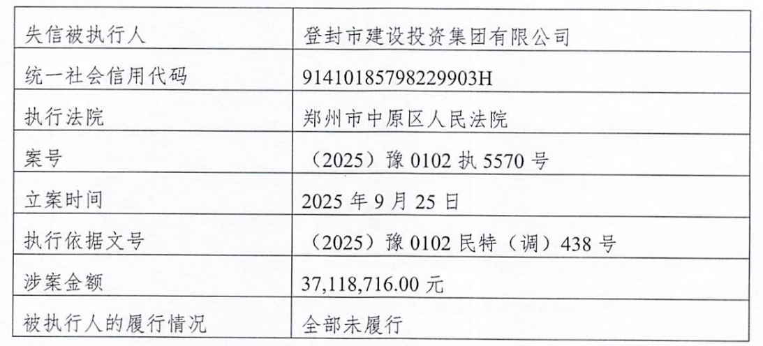 2025年12月份,登封建投发布公告称,该公司被列为失信被执行人,系该公司为登封电厂集团有限公司在华夏银行郑州分行续贷担保逾期所致,涉案金额3711.87万元,失信被执行人行为具体情形为“违反财产报告制度”,被执行人的履行情况为“全部未履行”。